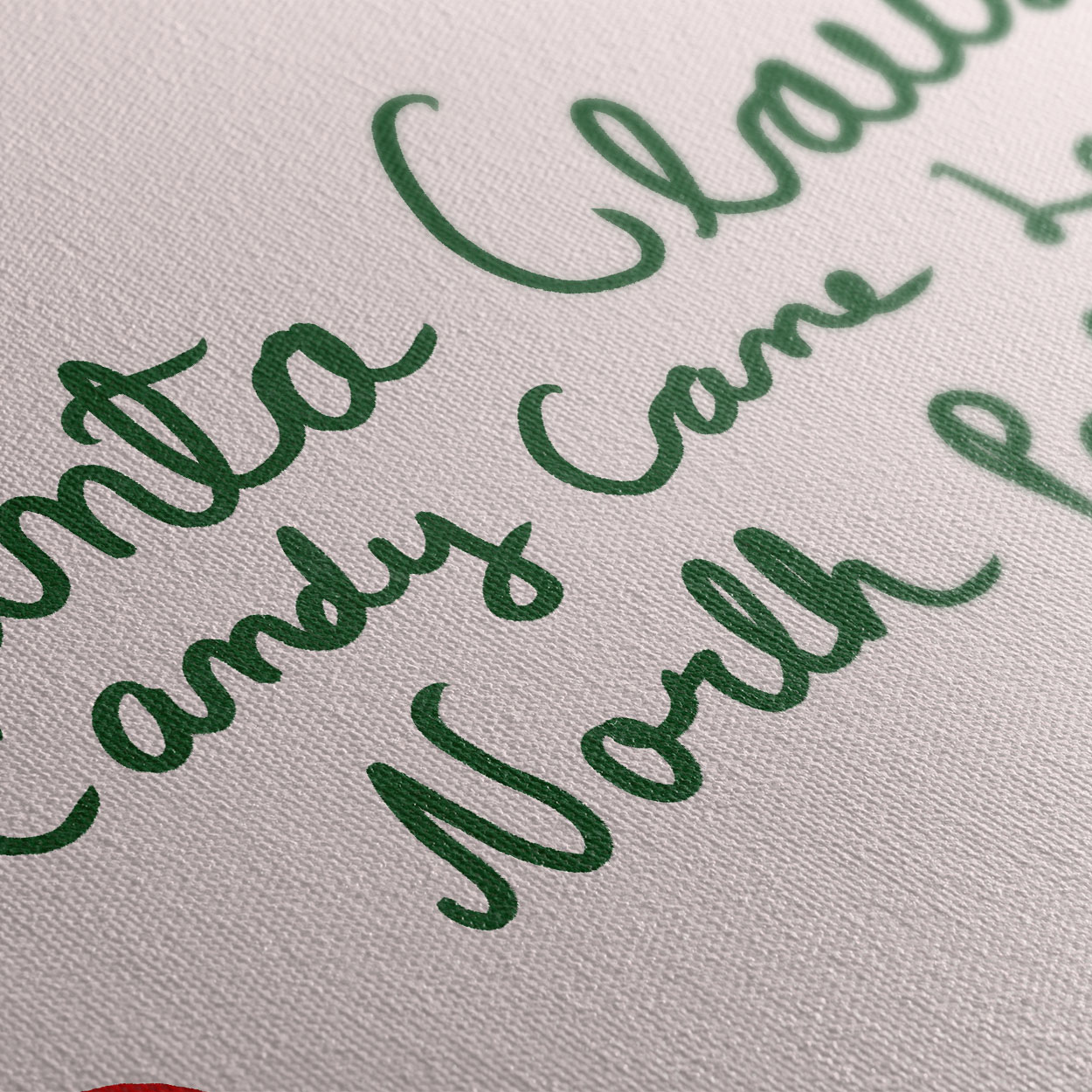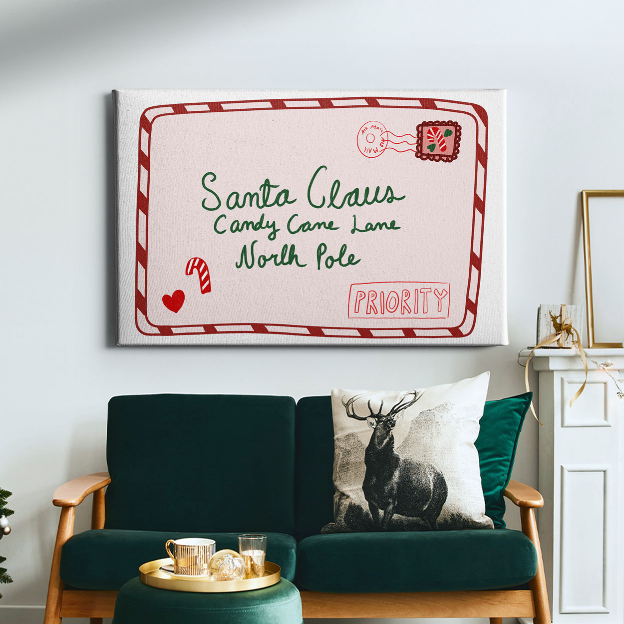Ζεστός, παιχνιδιάρικος πίνακας με γράμμα στον Άγιο Βασίλη, μια παιδική επιστολή προς τον Βόρειο Πόλο. Οι απλές, ρετρό γραμμές και τα χαριτωμένα εικονίδια (καραμέλα, καρδιά, σφραγίδα) εκπέμπουν νοσταλγία και γιορτινή τρυφερότητα. Ιδανικός για παιδικά δωμάτια, καταστήματα δώρων και χώρους που θέλουν μια ζεστή, χριστουγεννιάτικη νότα με ρετρό χαρακτήρα.
