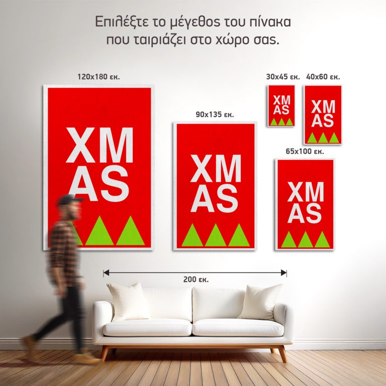 Ένας λιτός, σύγχρονος πίνακας με έντονο κόκκινο φόντο, μεγάλες λευκές γράμμες που σχηματίζουν το «XMAS» και τρία πράσινα δεντράκια, δυνατή γραφιστική αισθητική και καθαρές αντιθέσεις. Ιδανικός για βιτρίνες, μοντέρνα σαλόνια ή χώρους που θέλουν ένα τολμηρό χριστουγεννιάτικο στοιχείο.