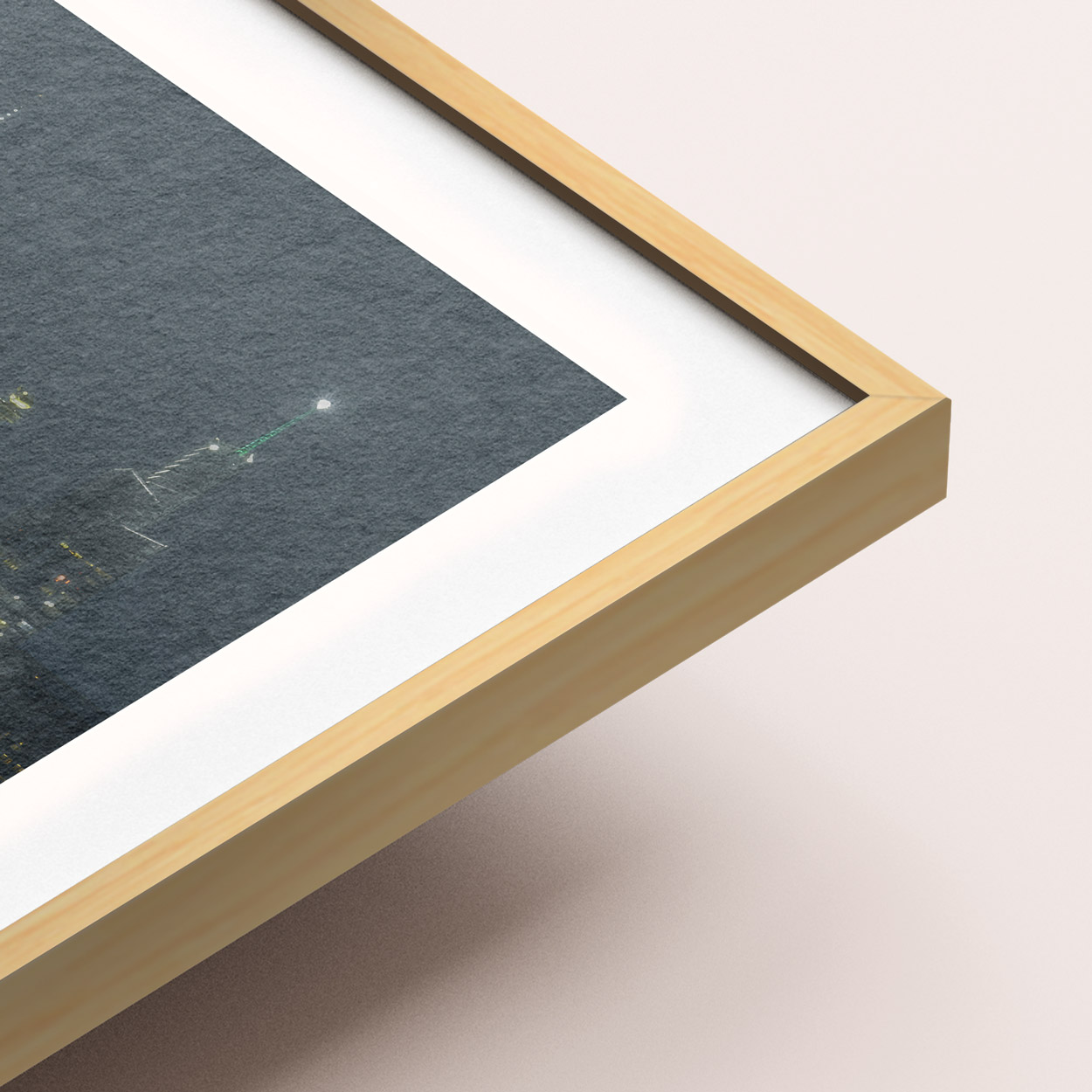 Η Αφίσα εκτυπώνεται με eco μελάνια, σε χαρτί κορυφαίας ποιότητας 200gr. και έχει ένα καταπληκτικό ματ φινίρισμα που ταιριάζει με όλα τα σχέδια της συλλογής μας. Το λευκό περιθώριο (Passpartout) αποτελεί την χάρτινη γέφυρα μεταξύ του έργου και του πλαισίου εστιάζοντας στο θέμα και ομαλοποιεί τη μετάβαση από το κέντρο προς τον ευρύτερο χώρο ενισχύοντας τις διακοσμητικές ιδιότητες του. Η κάθε διάσταση εκτύπωσης έχει και την δική της διάσταση περιθωρίου (Passpartout). Παρακαλώ ανατρέξτε στον πίνακα που αναγράφονται αναλυτικά οι διαστάσεις, ώστε να επιλέξετε αυτό που σας ταιριάζει καλύτερα. Η κορνίζα που χρησιμοποιούμε είναι από ξύλο πεύκου και πάχους 17mm x 17mm, και μπορείτε να επιλέξετε χρώμα ανάμεσα σε λευκό, μαύρο και χρώμα του ξύλου ανοιχτό. To plexiglass στην μπροστά όψη είναι ανθεκτικό και διάφανο στα 2mm, η πλάτη είναι από mdf και στο πίσω μέρος υπάρχει και το μεταλλικό κλιπ κρέμασης.