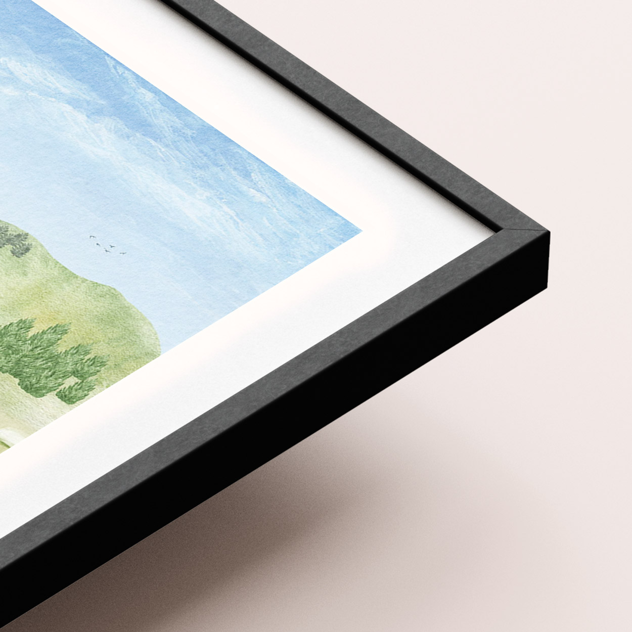 Η εκτύπωση γίνεται με eco μελάνια σε χαρτί υψηλής ποιότητας 200gr. με ματ φινίρισμα και η κορνίζα είναι από ξύλο πεύκου και πάχους 17mm x 17mm.