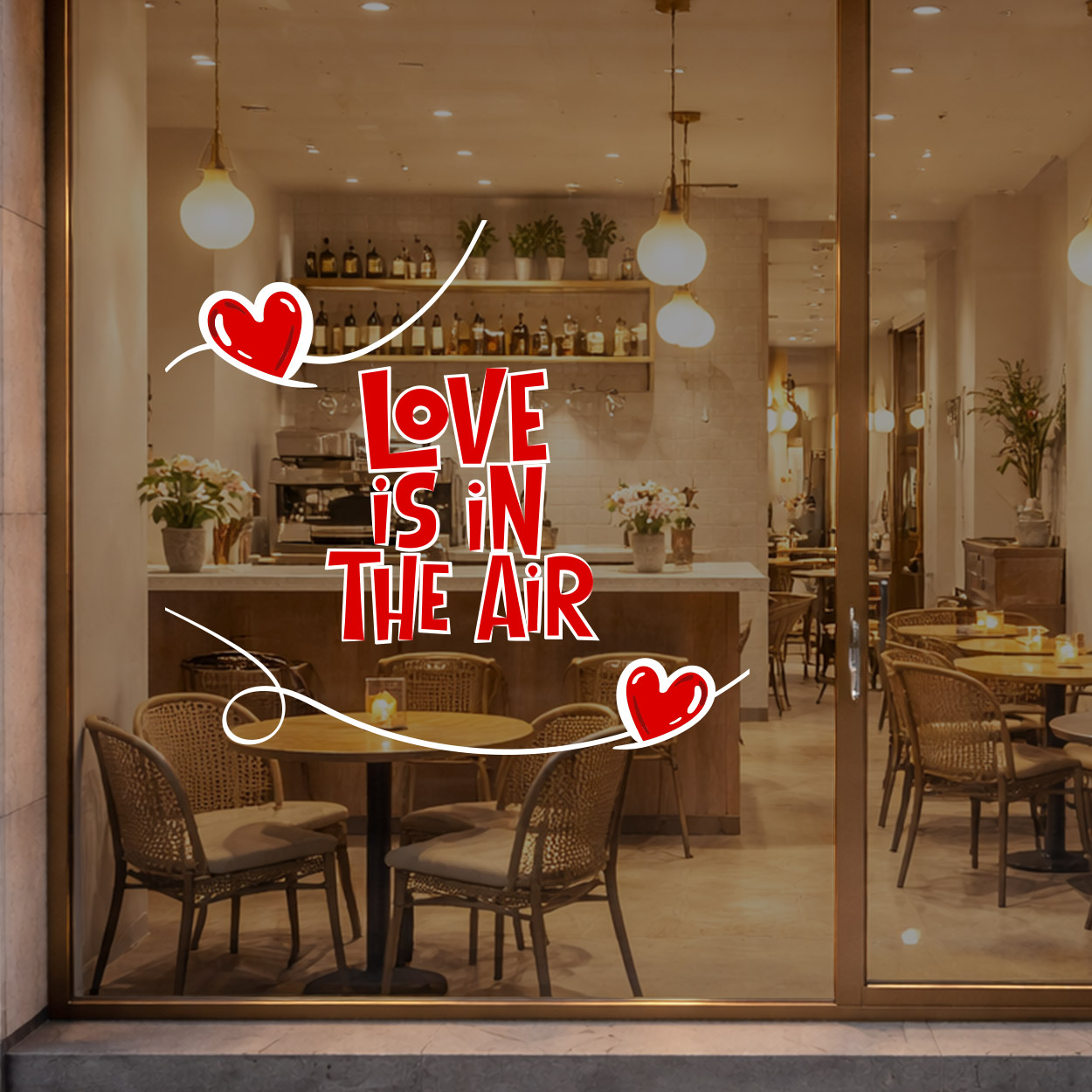 Με τα Αυτοκόλλητα Τοίχου του Decotek δώστε μια ρομαντική και γιορτινή νότα στο κατάστημά σας με το αυτοκόλλητο "Love is in the Air". Με μοντέρνα καλλιγραφική γραμματοσειρά και ρομαντικά στοιχεία, όπως καρδιές και ερωτευμένα σχέδια, αποτελούν την ιδανική επιλογή για εποχιακή διακόσμηση που ξεχωρίζει.