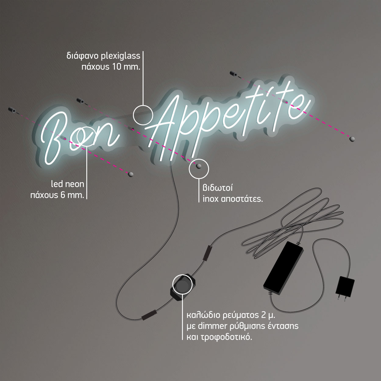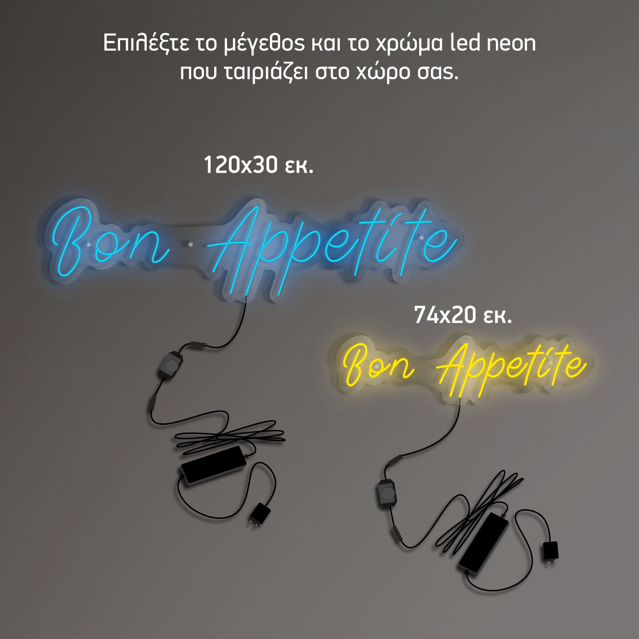Φωτίστε το χώρο σας με την πινακίδα LED Neon ‘Bon Appetite’.Κατασκευασμένη από ανθεκτικό και ενεργειακά αποδοτικό LED neon flex, η έκφραση ‘Καλή Όρεξη’ ταιριάζει τέλεια σε επαγγελματικούς χώρους εστίασης αλλά και στην κουζίνα ή την τραπεζαρία του σπιτιού σας.