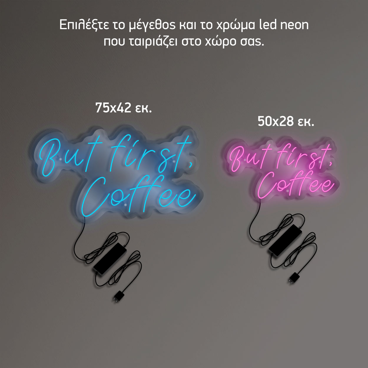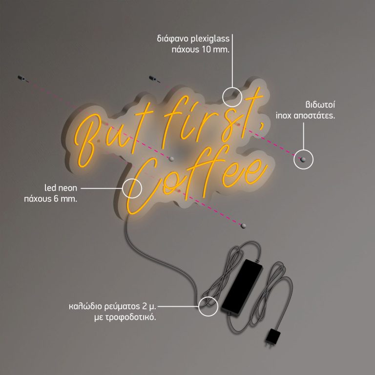 Επιγραφή LED Neon 'But first coffee'. Κατασκευασμένη από υψηλής ποιότητας LED neon flex, αυτή η επιγραφή φωτίζει το περιβάλλον σας με ένα ζεστό και φιλόξενο φως που είναι ενεργειακά αποδοτικό και μακράς διάρκειας.