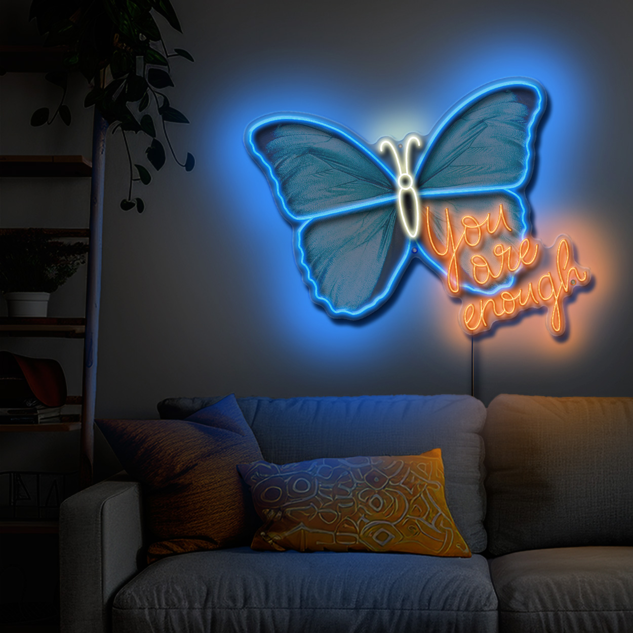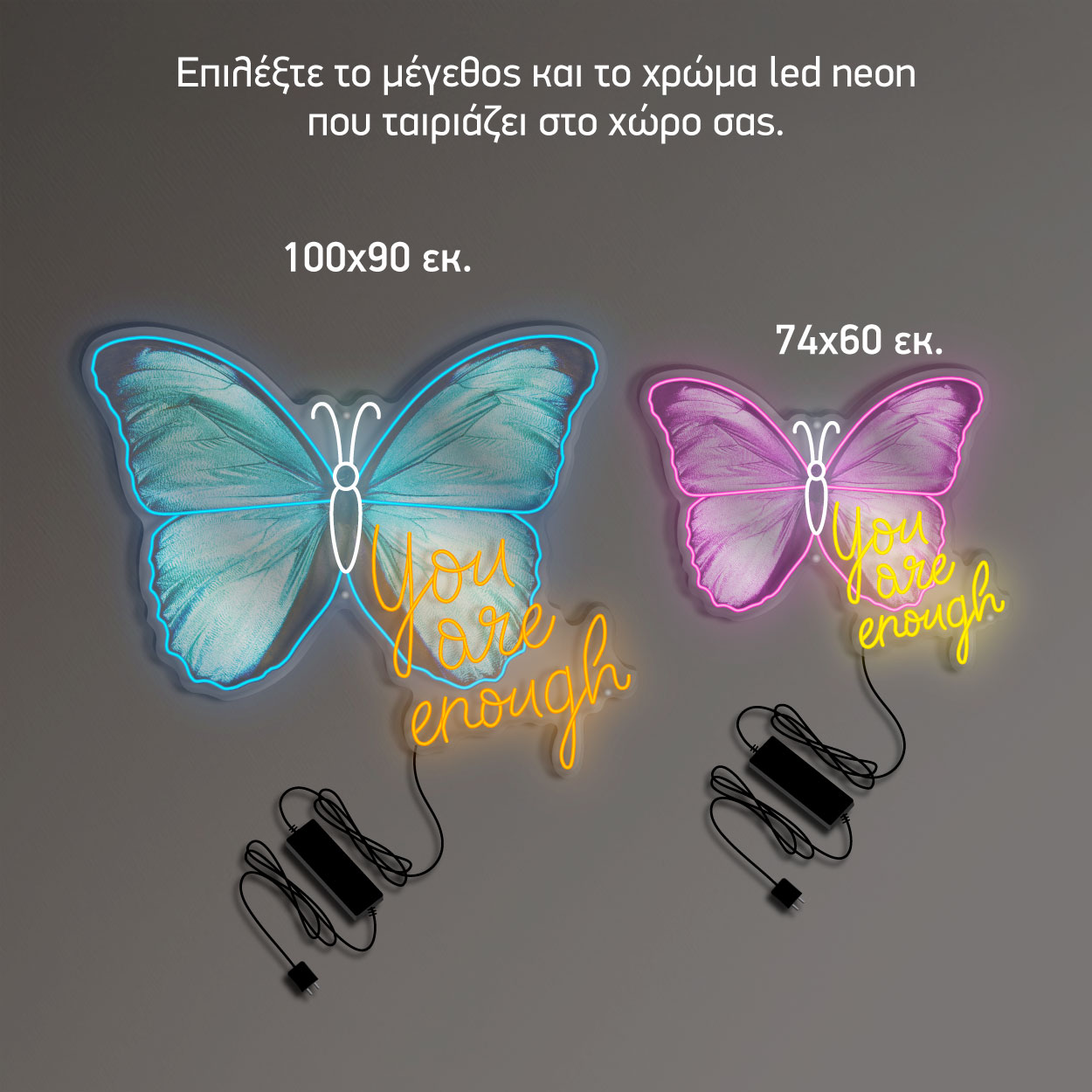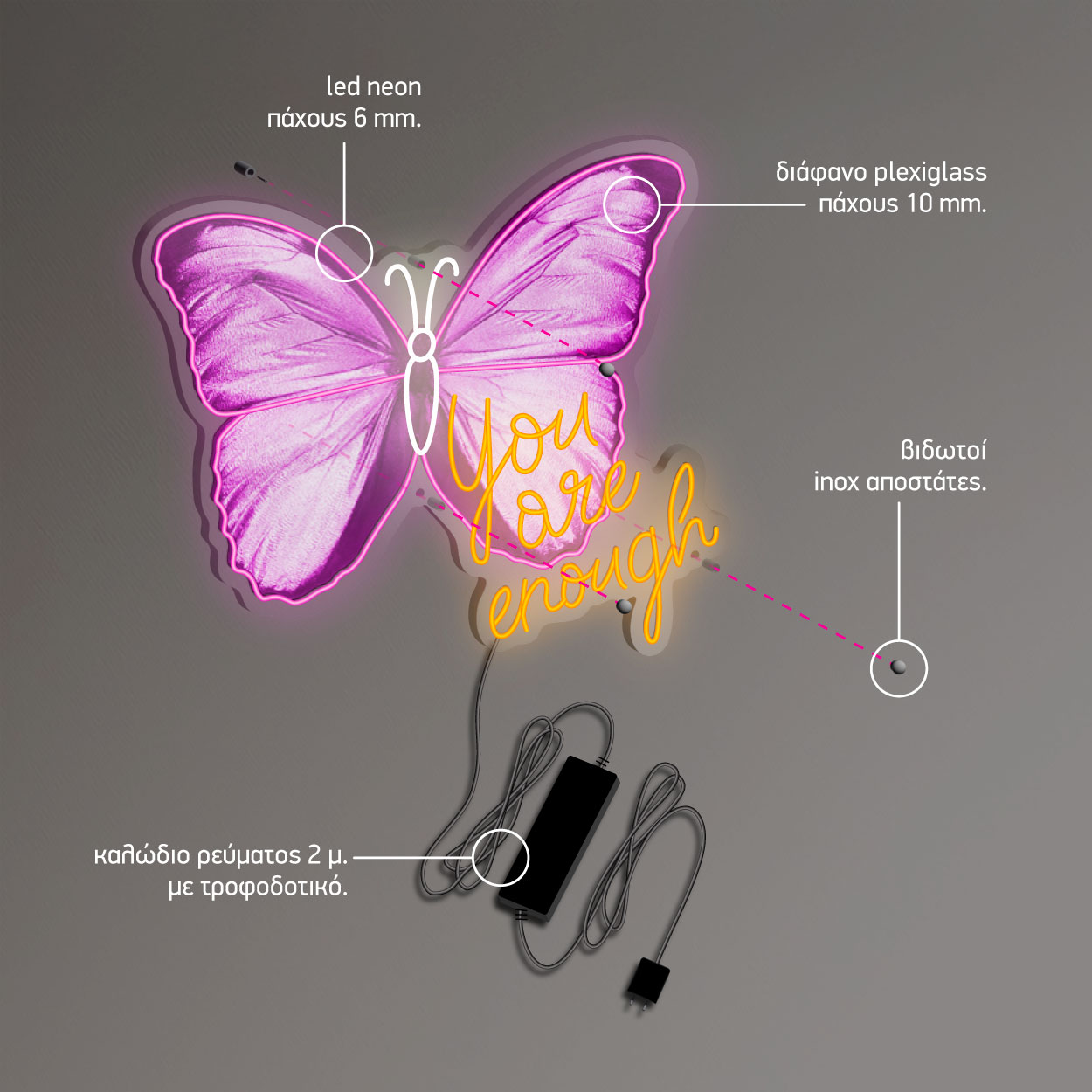 Επιγραφή LED Neon 'Butterfly Effect'. Κατασκευασμένη από υψηλής ποιότητας LED neon flex, αυτή η επιγραφή φωτίζει το περιβάλλον σας με ένα ζεστό και φιλόξενο φως που είναι ενεργειακά αποδοτικό και μακράς διάρκειας. Η συσκευασία περιλαμβάνει το πλέξυγκλας πάχους 10 χλστων, εκτυπωμένο βινύλιο στην πίσω όψη, led flex και καλώδιο συνολικού μήκους 2 μέτρων (το τροφοδοτικό είναι μαζί με το καλώδιο). Εάν θέλετε διαφορετικό μήκος καλωδίου σημειώστε το στις παρατηρήσεις κατά την παραγγελία σας. Υπάρχει η δυνατότητα να προσθέσουμε dimmer για την αυξομείωση της φωτεινότητας με επιπλέον χρέωση.