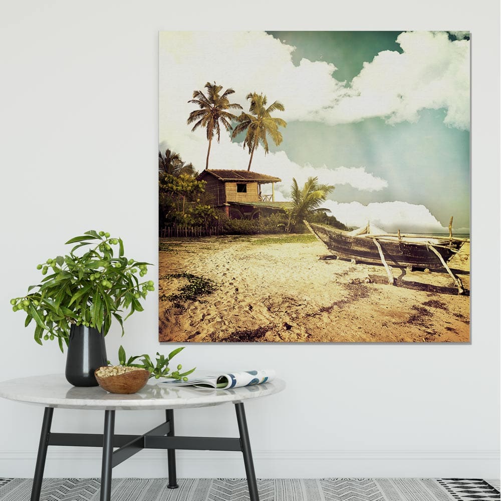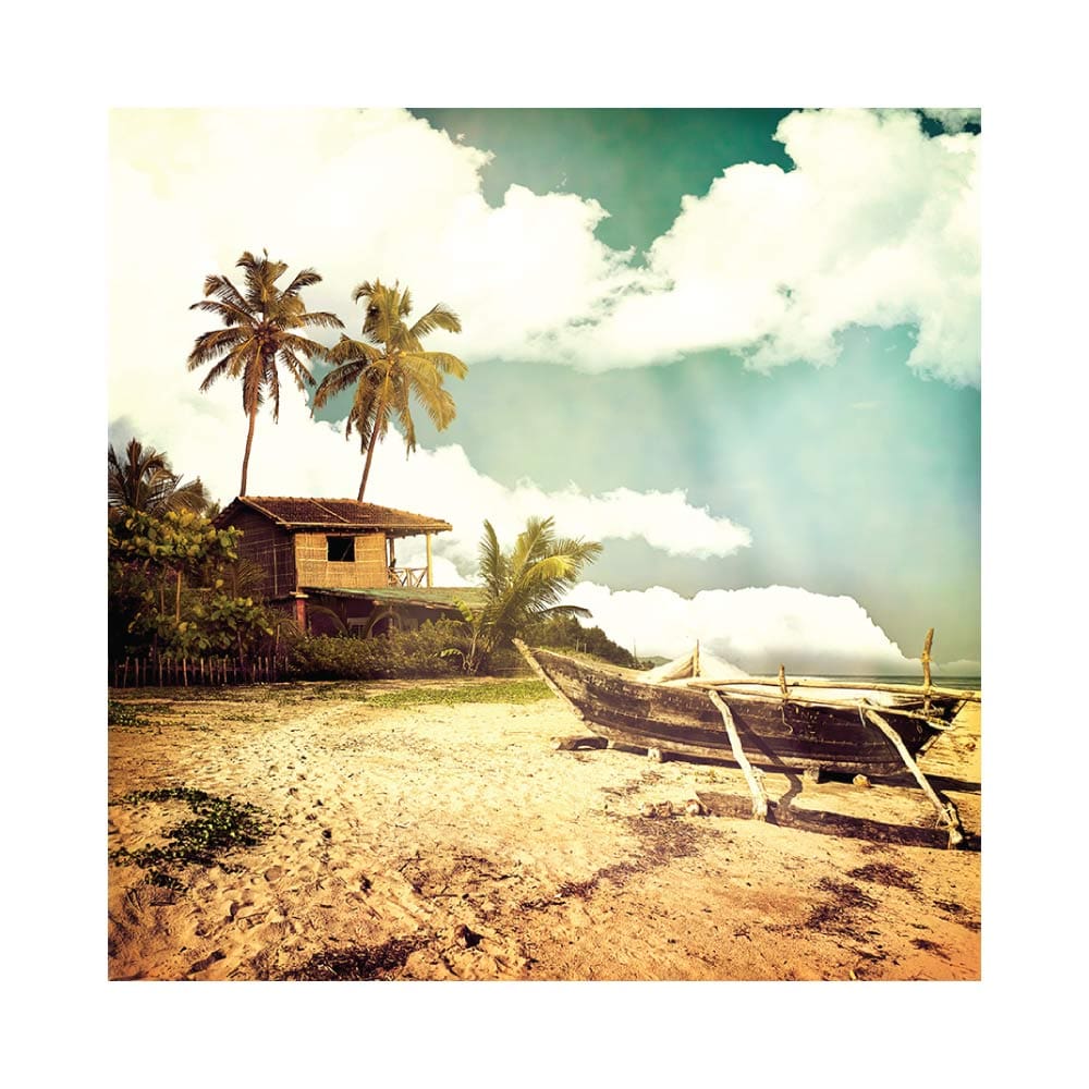 Πίνακας Ζωγραφικής σε καμβά, παραθαλάσσιο σπίτι με φοίνικες και μια παλιά ξύλινη βάρκα στην παραλία.