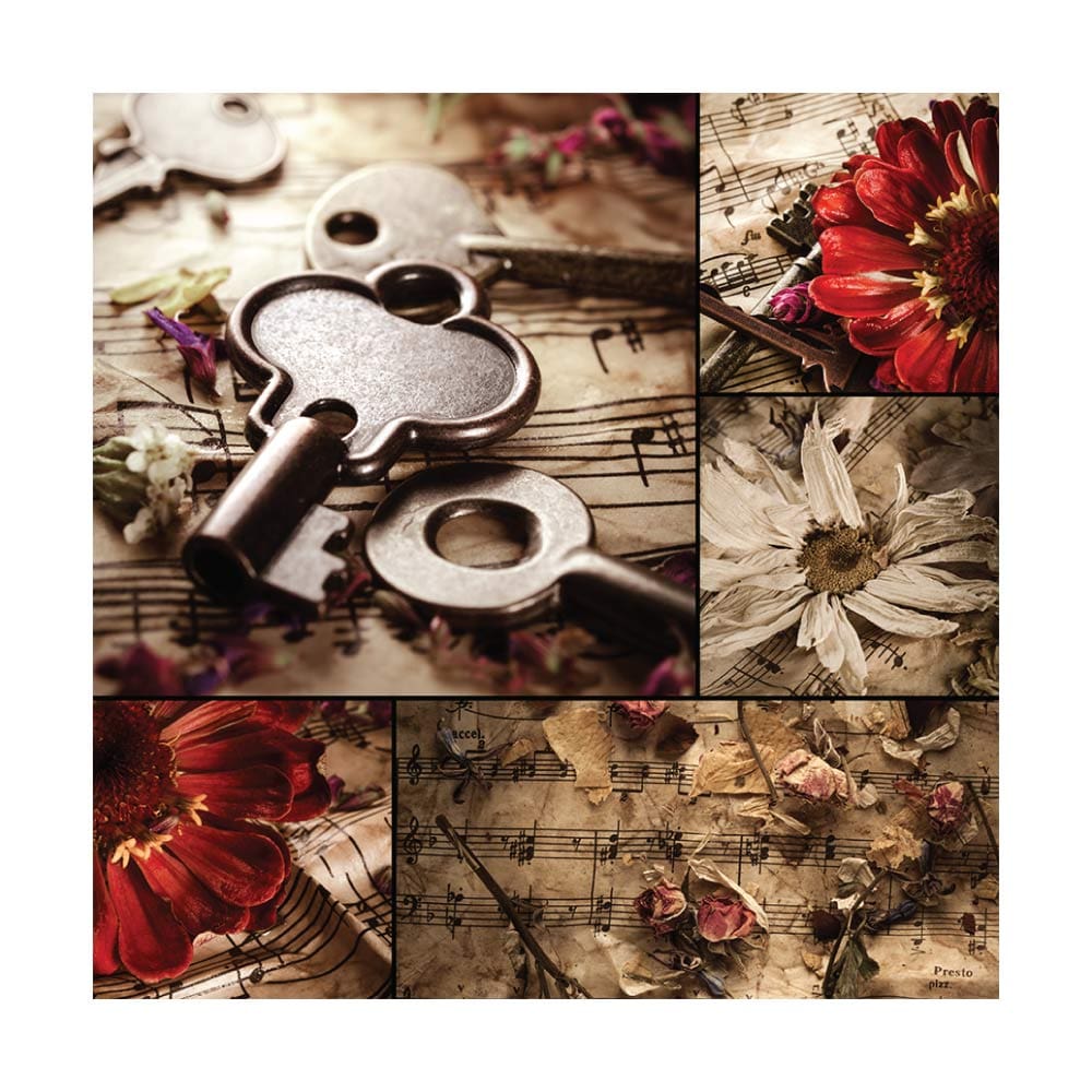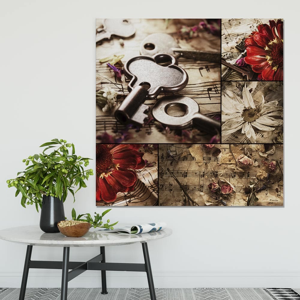 Πίνακας Ζωγραφικής σε καμβά vintage κλειδάκια και άνθη λουλουδιών επάνω σε φύλλα πεντάγραμμου.