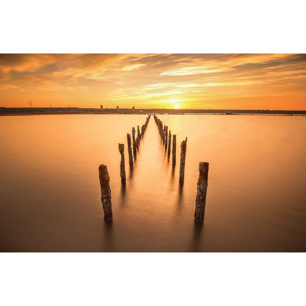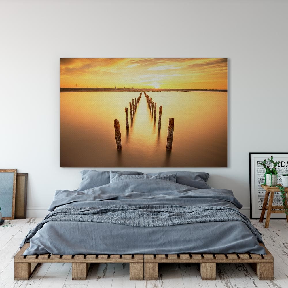 Πίνακας Ζωγραφικής σε καμβά ξύλινοι πάσαλοι στο νερό μέσα στο φως του ηλιουβασιλέματος.