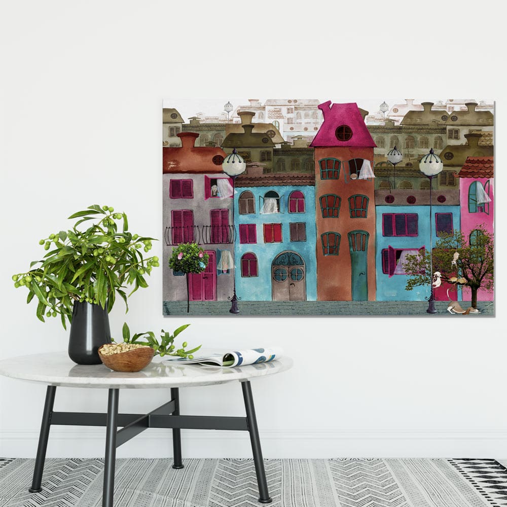 Πίνακας Ζωγραφικής σε καμβά μπεζ,μπλε, γκρι και ροζ σπίτια.