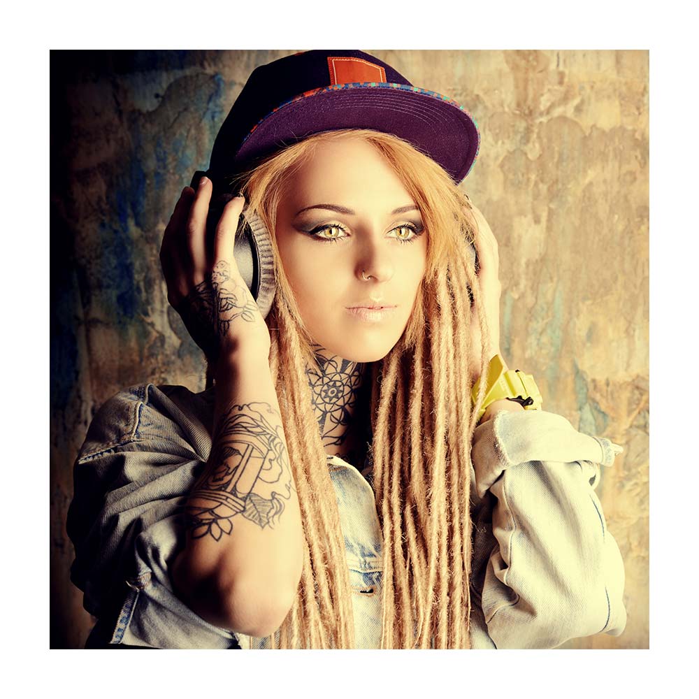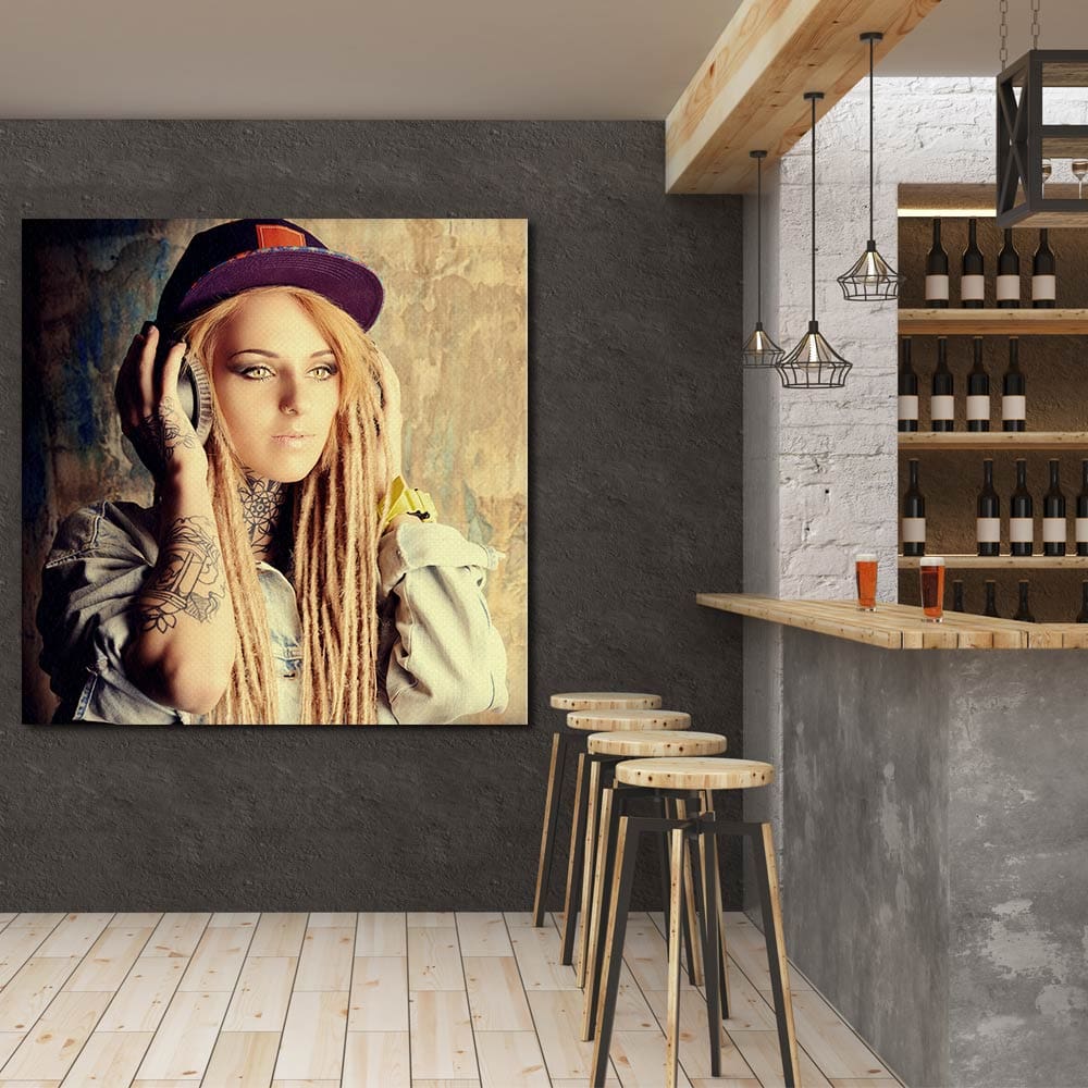 Πίνακας Ζωγραφικής σε καμβά όμορφη ξανθιά κοπέλα που ακούει μουσική με τα ακουστηκά της.