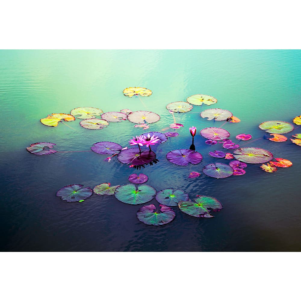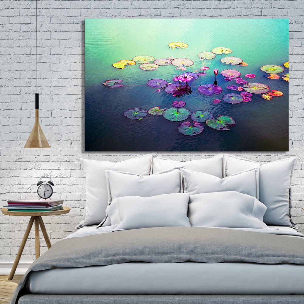 Πίνακας Ζωγραφικής σε καμβά πολύχρωμοι λωτοί που εξαπλώνονται στην γαλάζια λίμνη.