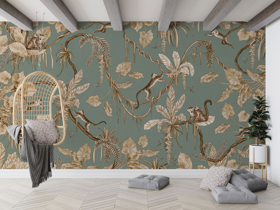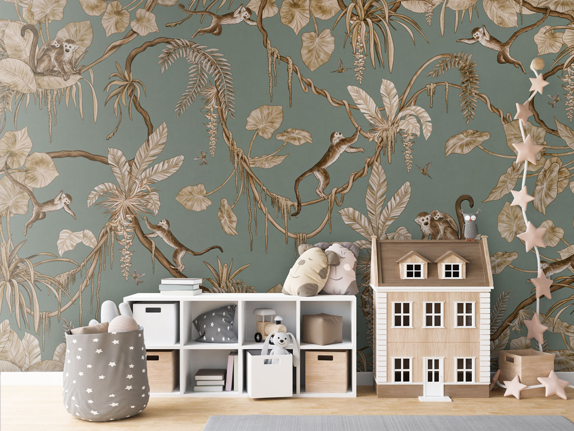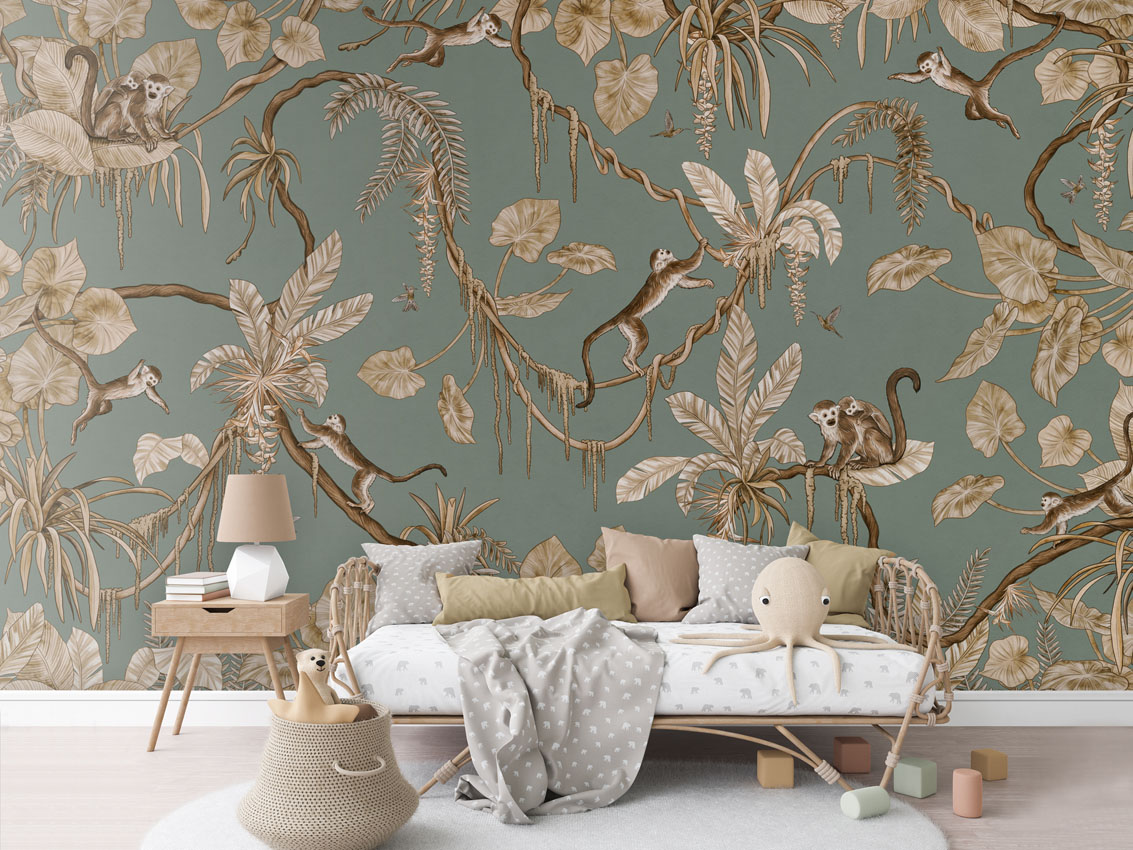 Φωτοταπετσαρία Playful Monkeys, vintage green – Kikki Belle 60895