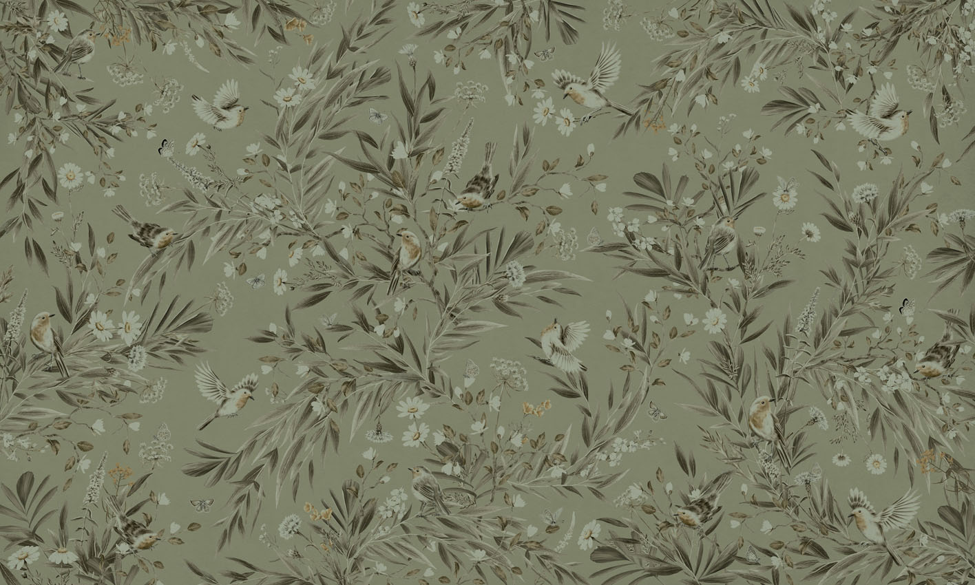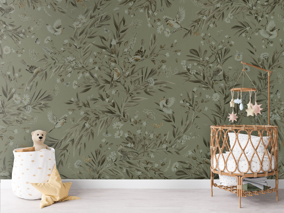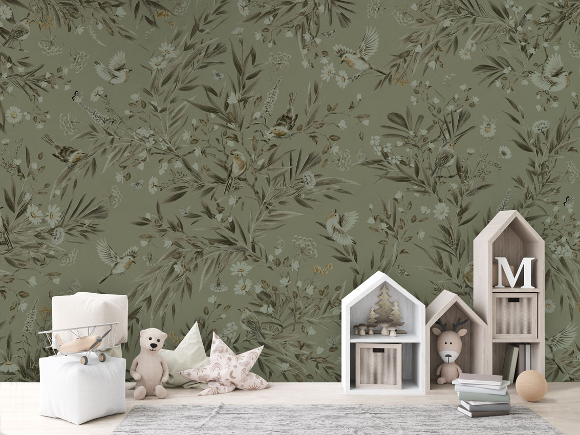 Φωτοταπετσαρία Playful Robins, monochrome green – Kikki Belle 60903