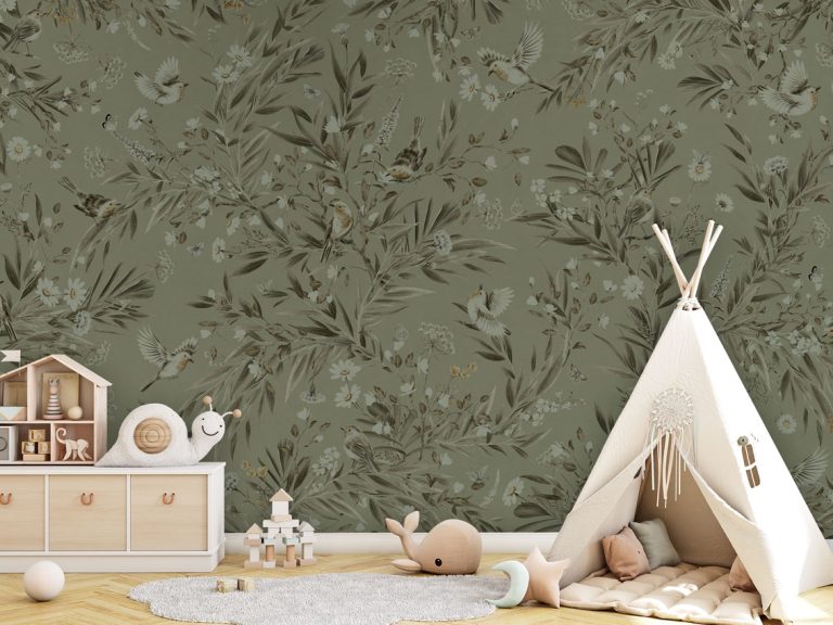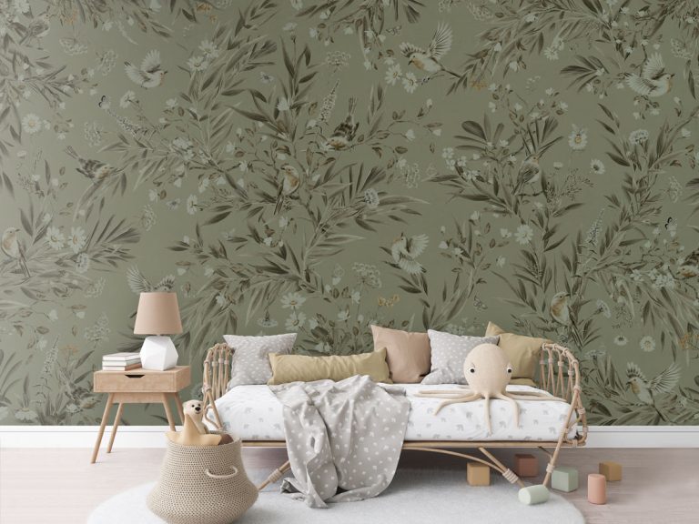 Φωτοταπετσαρία Playful Robins, monochrome green – Kikki Belle 60903