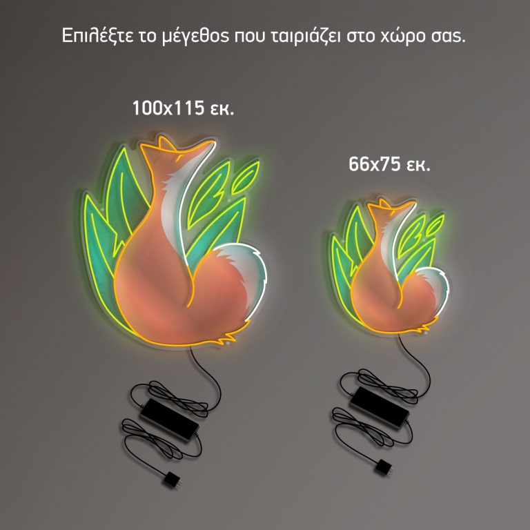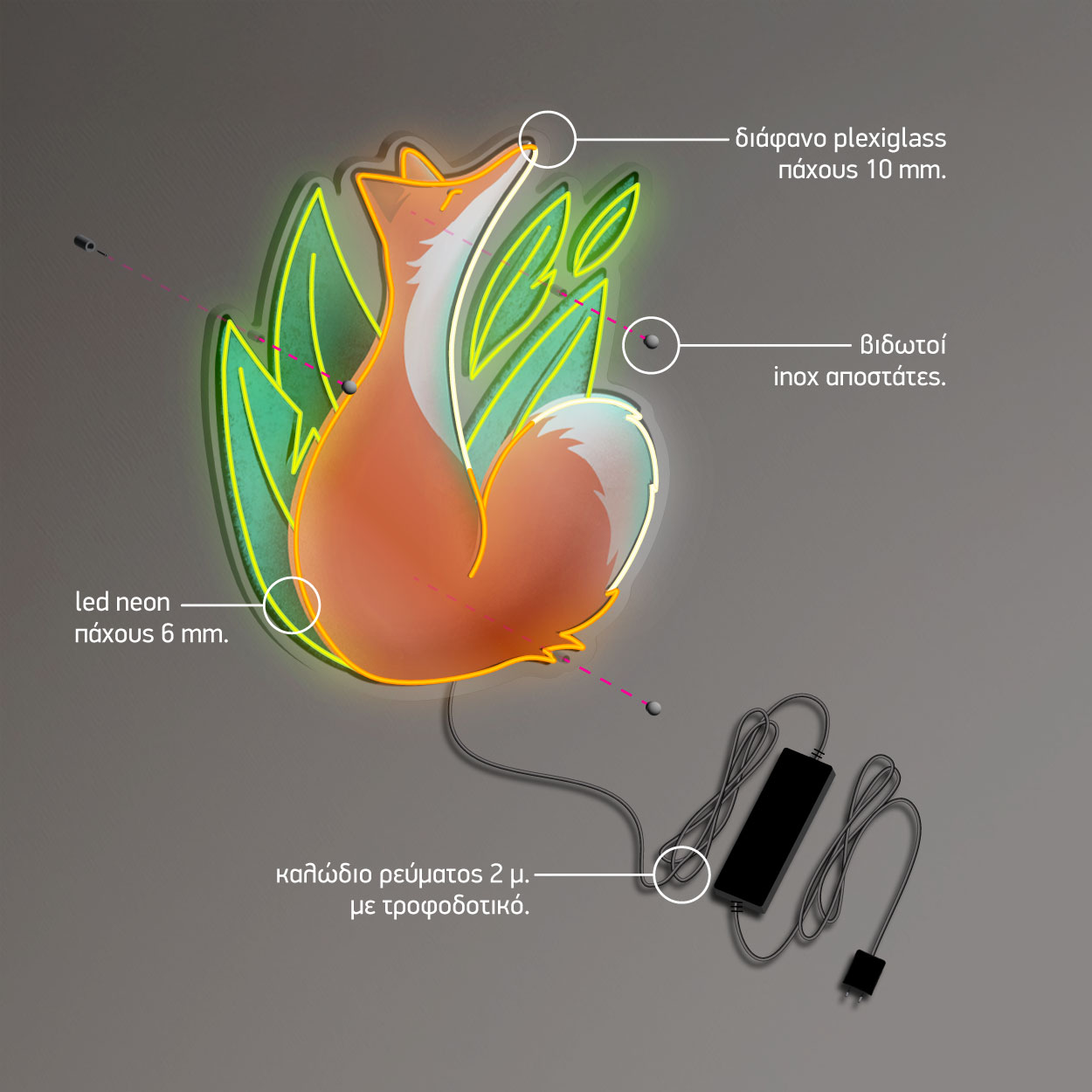 Επιγραφή LED Neon 'Lucky Fox'. Κατασκευασμένη από υψηλής ποιότητας LED neon flex, αυτή η επιγραφή φωτίζει το περιβάλλον σας με ένα ζεστό και φιλόξενο φως που είναι ενεργειακά αποδοτικό και μακράς διάρκειας. Η συσκευασία περιλαμβάνει το πλέξυγκλας πάχους 10 χλστων, εκτυπωμένο βινύλιο στην πίσω όψη, led flex και καλώδιο συνολικού μήκους 2 μέτρων (το τροφοδοτικό είναι μαζί με το καλώδιο). Εάν θέλετε διαφορετικό μήκος καλωδίου σημειώστε το στις παρατηρήσεις κατά την παραγγελία σας. Υπάρχει η δυνατότητα να προσθέσουμε dimmer για την αυξομείωση της φωτεινότητας με επιπλέον χρέωση.