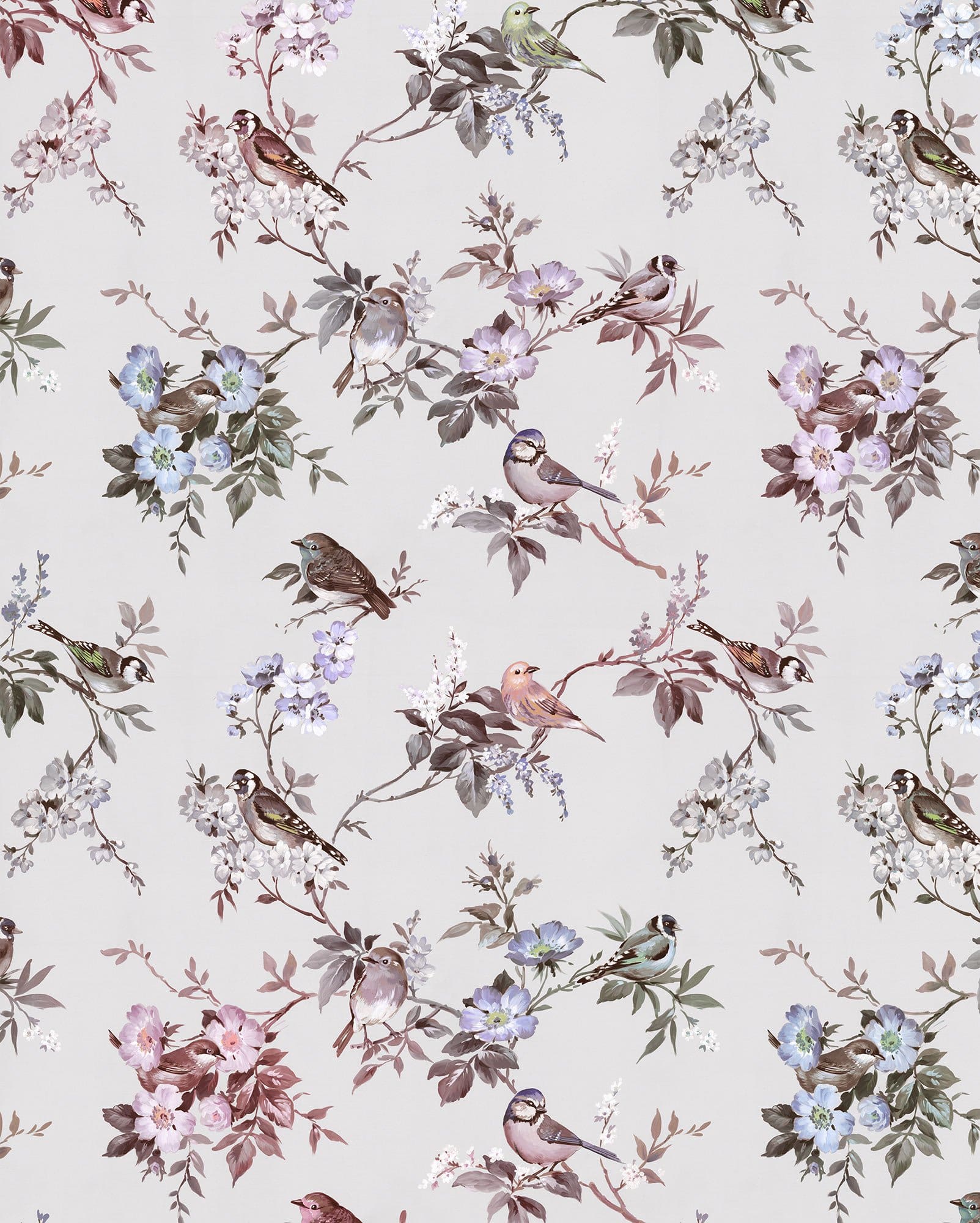 This photomural captivates its observers with its delicate pastel tones. Purple and pink birds flutter to and fro between fragrant little flowers, singing their happy song about the lightness of being.
