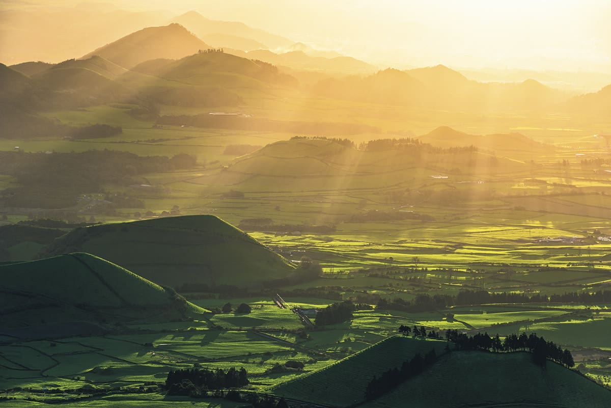 The first sunrays of the day are gently touching the green valleys of Sao Miguel in Portugal.
