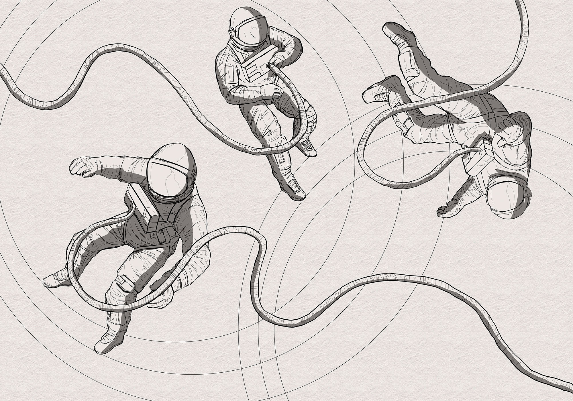 Οι αστροναύτες κινούνται χωρίς βάρος στο σύμπαν απλώς συνδέονται μόνο με το διαστημόπλοιο με ένα λεπτό καλώδιο.