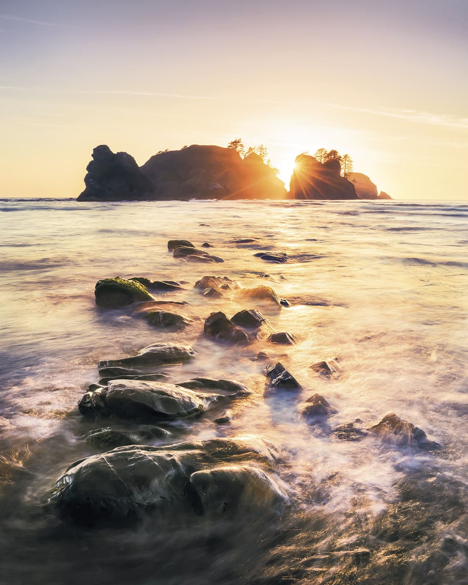 Golden rays are illuminating the rocks of Point of Arches, USA in a romantic light.