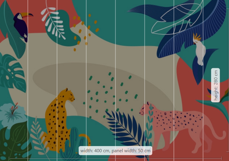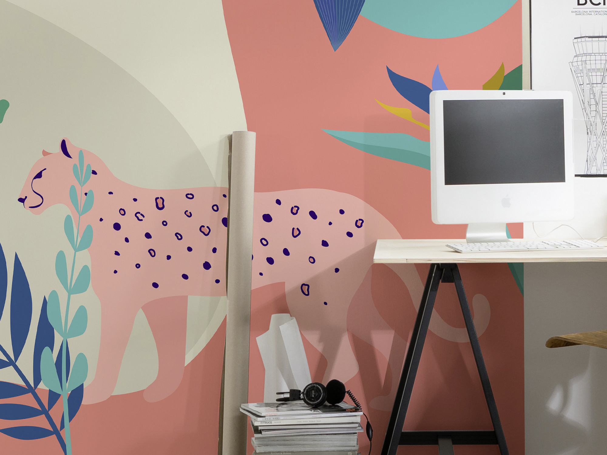 Σε αυτήν την πολύχρωμη ταπετσαρία, τα εξωτικά ζώα και τα φυτά συναντούν φωτεινά χρώματα και αφηρημένο σχεδιασμό.