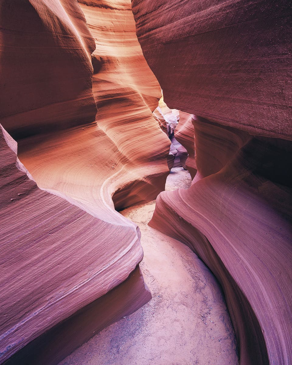 From dark violets to bright orange shimmer the rocks at Antelope Canyon are facing the sunlight.