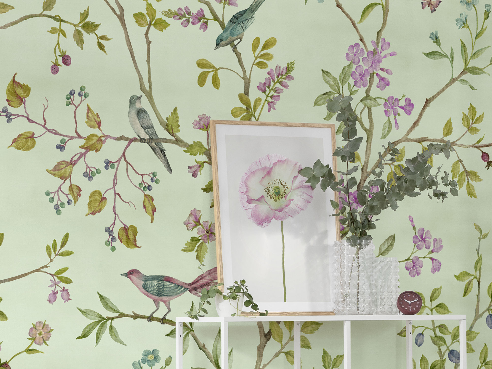 Αυτή η ταπετσαρία μπορεί να ζωντανέψει αμέσως κάθε δωμάτιο, το χαρούμενο floral print και τα πολύχρωμα πουλιά ξεχειλίζουν από χαρά!