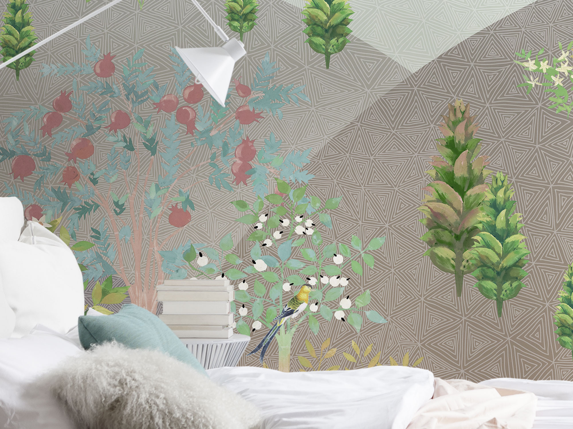 Υπάρχουν τόσα πολλά να ανακαλύψετε εδώ. Αυτή η περσικού στυλ ταπετσαρία απεικονίζει μια δασική σκηνή με πολύχρωμα πουλιά ανάμεσα σε λόφους. Ένα καθόλα φιλικό μοτίβο που ενσαρκώνει την εγγύτητα με τη φύση και την εύφορη γη μας!