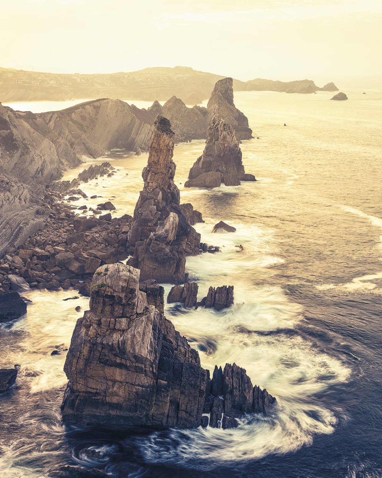 Off the coast of Northern Spain rugged, rocky peaks and breaking waves in the golden sunlight.