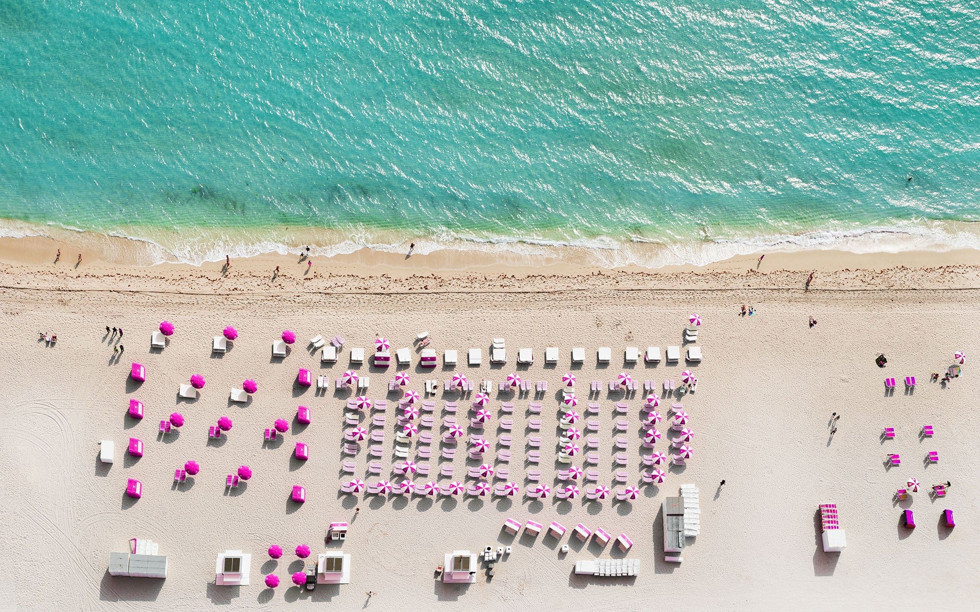 The more you look at this beach scene dotted with pink sunshades, the more details you discover. Holiday feeling at its very best.