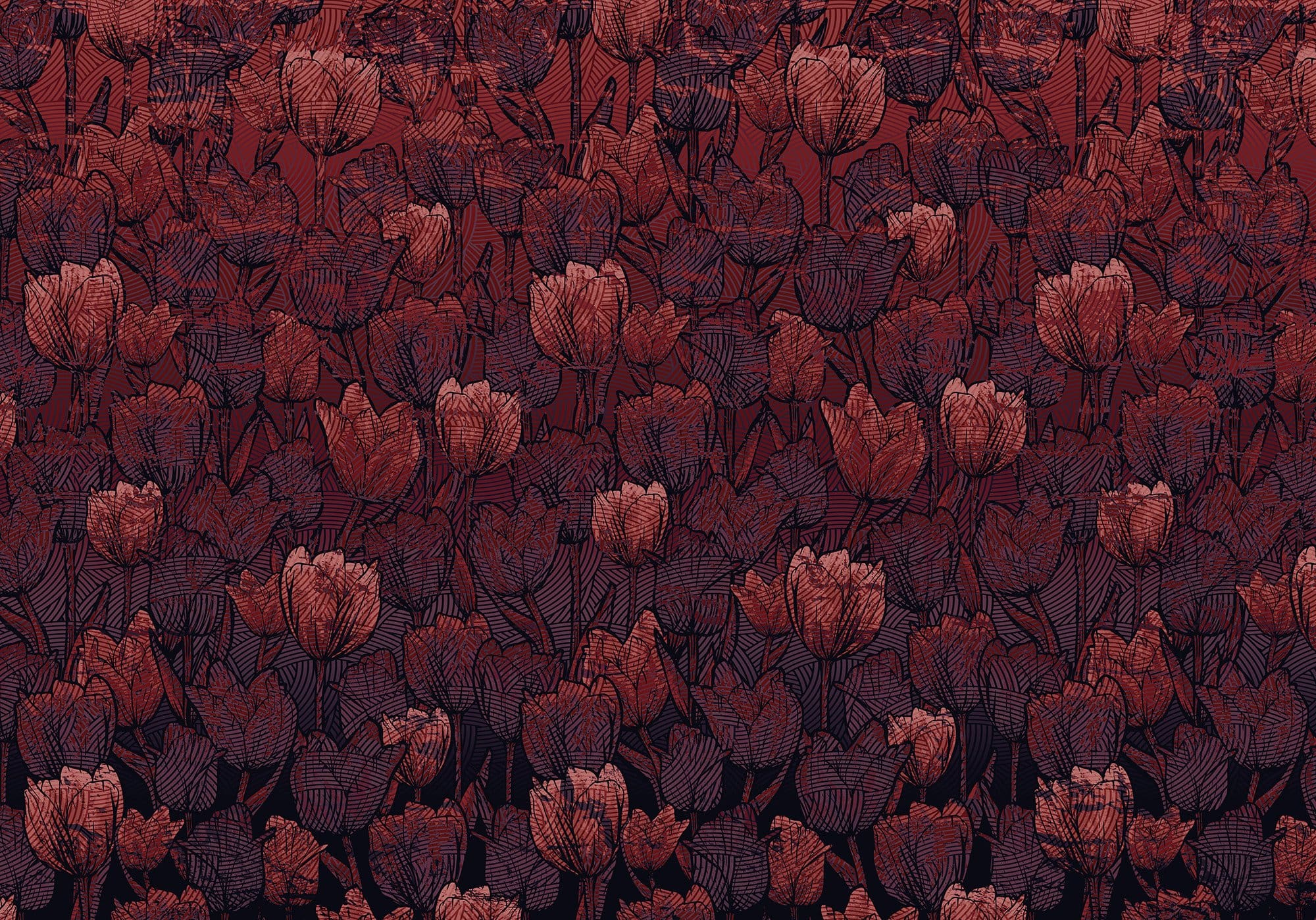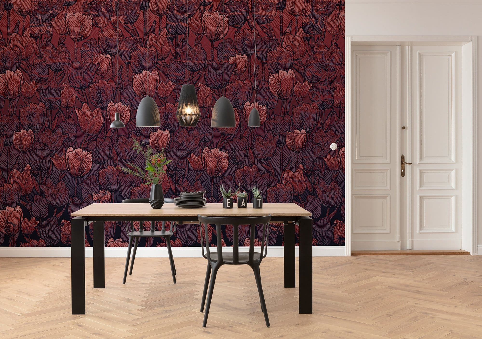 Ντελικάτες τουλίπες σε λαμπερό κόκκινο προσθέτουν κομψή πολυτέλεια στους τοίχους.