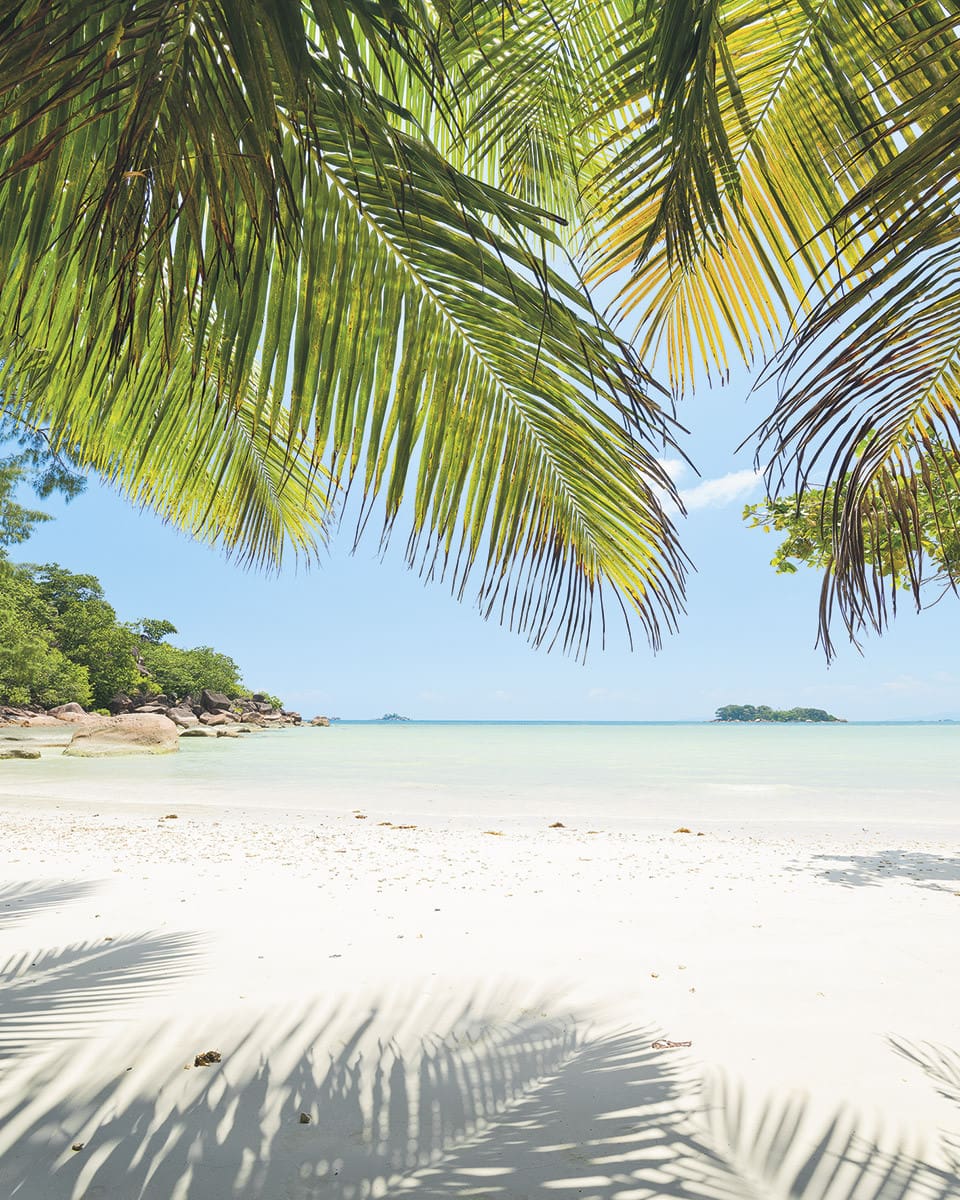 Pure holiday feelings! Shades of palm trees on a white, sandy beach including a fantastic view of the turquoise ocean – this is a great place to relax.