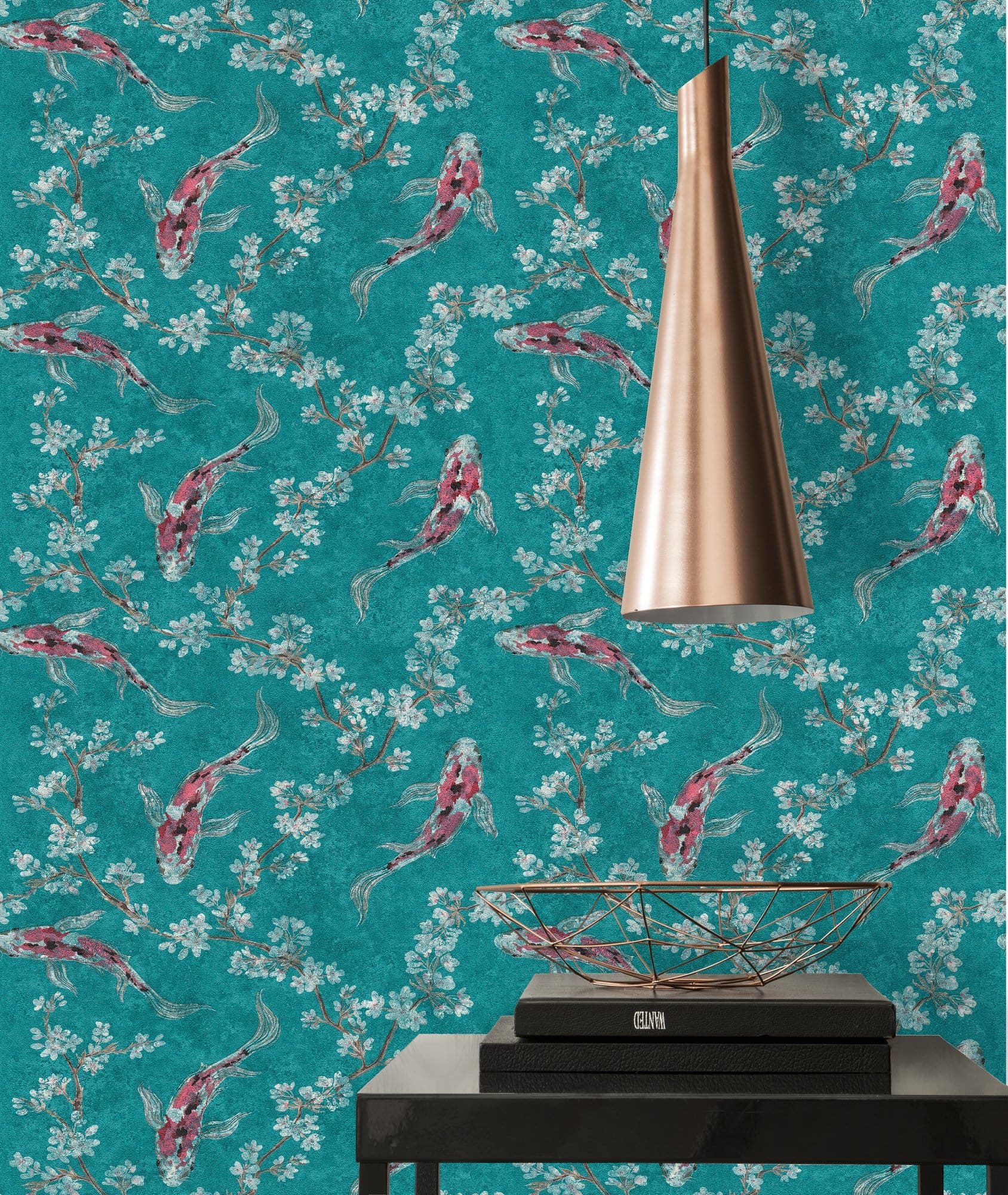 Φλοράλ Ταπετσαρία τοίχου με λουλούδια και ψαράκια σε καφέ, μπλε, κρεμ και πράσινες αποχρώσεις.