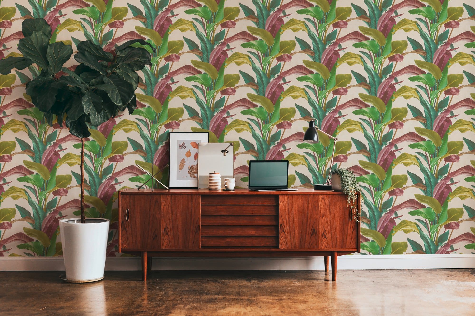 φλοράλ σχέδιο με κόκκινα, πράσινα και κίτρινα φύλλα σε κρεμ φόντο για την συλλογή Metropolitan Stories II.