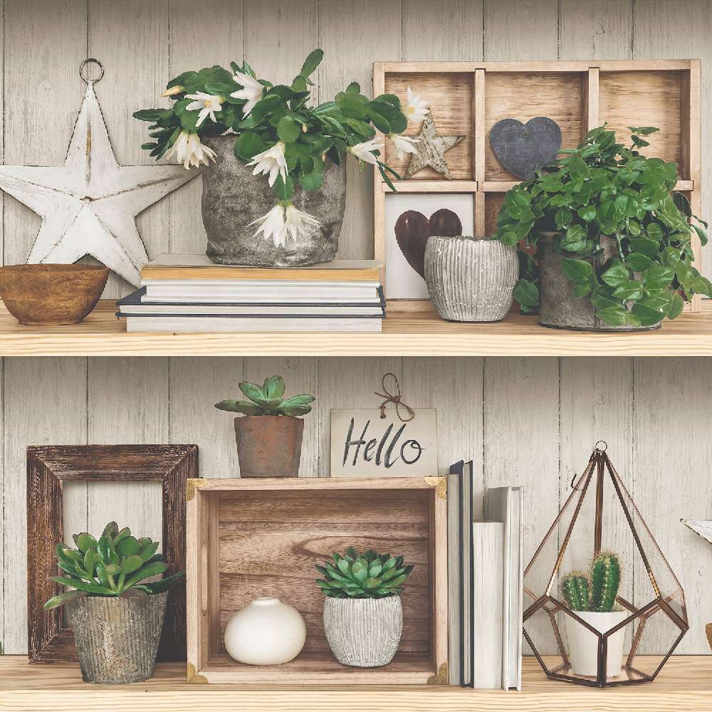 Φυτά και διακοσμητικά σε μπέζ ράφια για την συλλογή Exposure.
