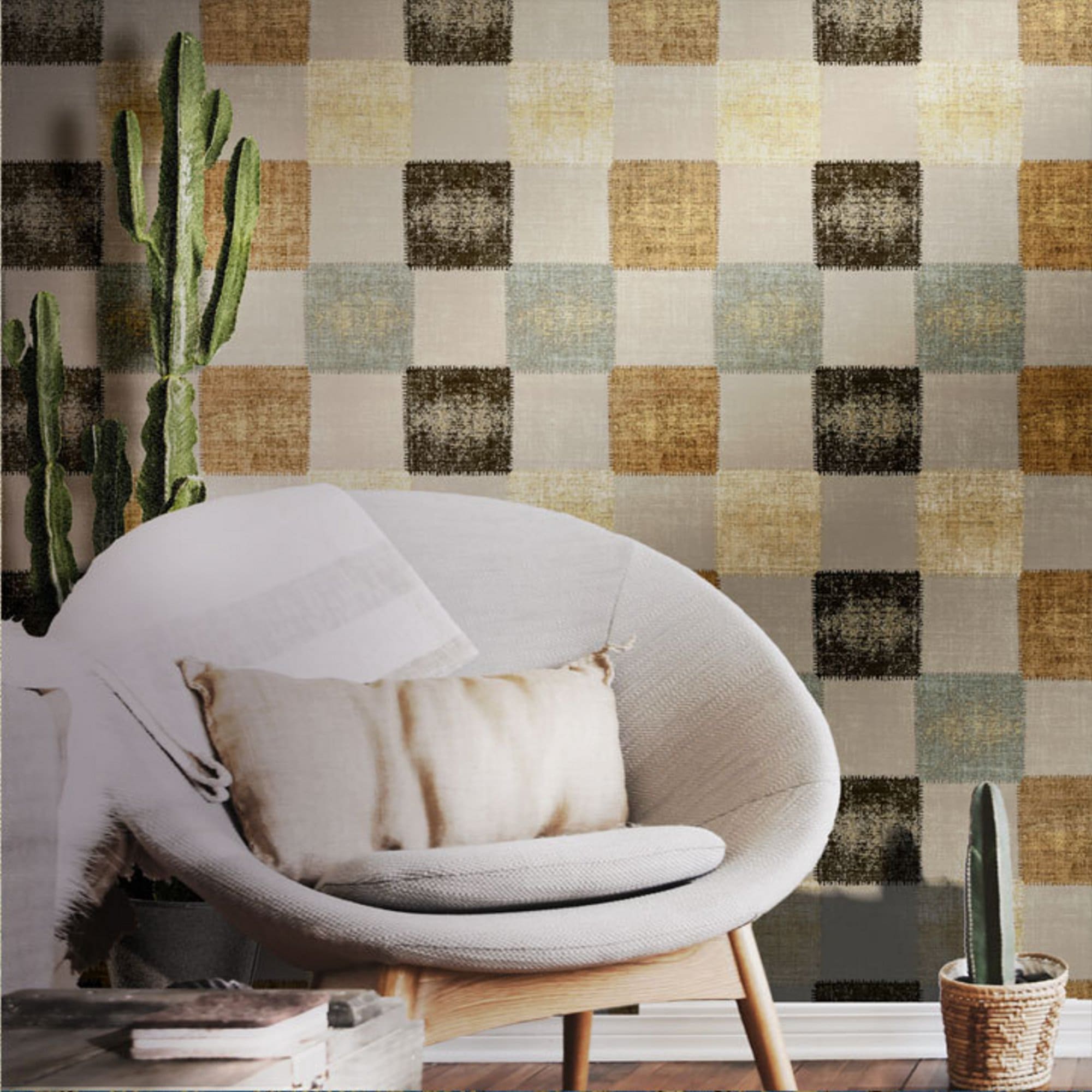 Γεωμετρικό σχέδιο με τετράγωνα σε καφέ, γκρι, μπλε και χρυσό χρώμα για την συλλογή Zero.
