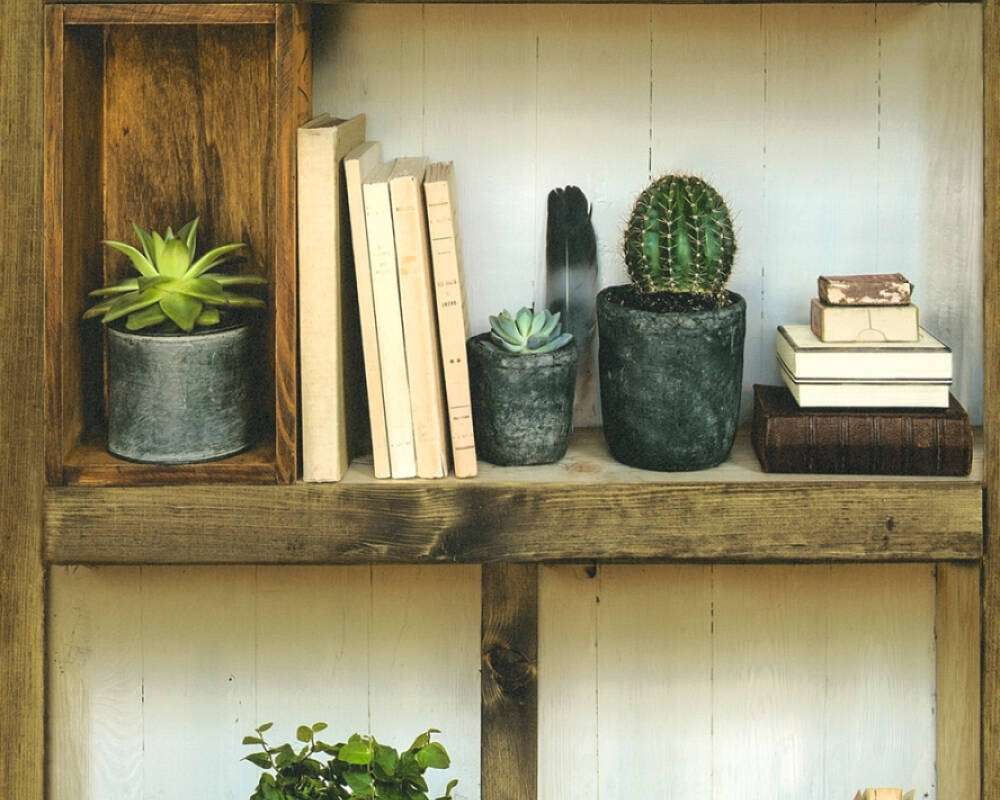 Ξύλινη βιβλιοθήκη με βιβλία και κάκτους σε καφέ και μπέζ αποχρώσεις για την συλλογή Authentic Walls 2.