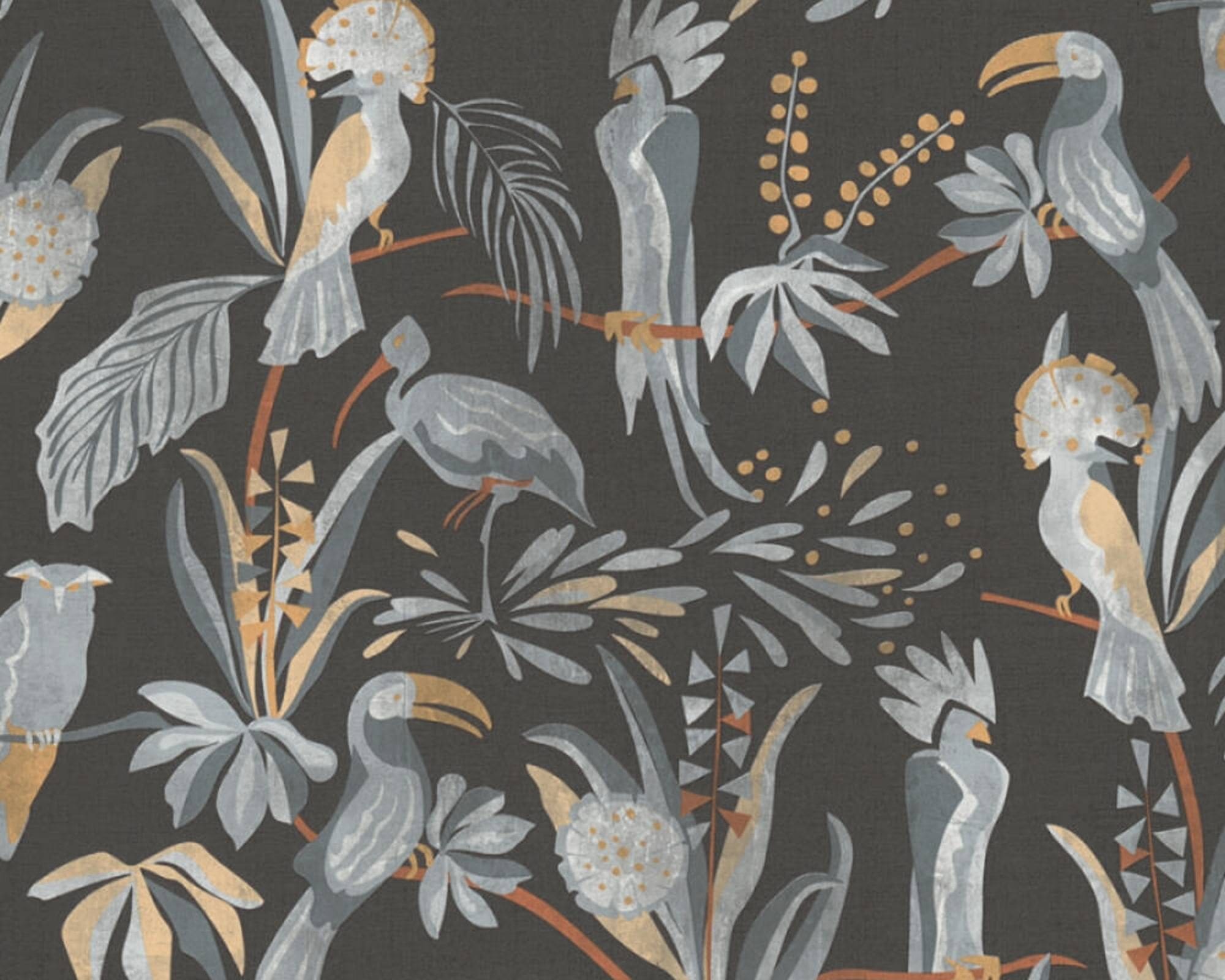 Τροπικά φυτά και πουλιά σε γκρι και μπεζ αποχρώσεις για την συλλογή House of Turnowsky.