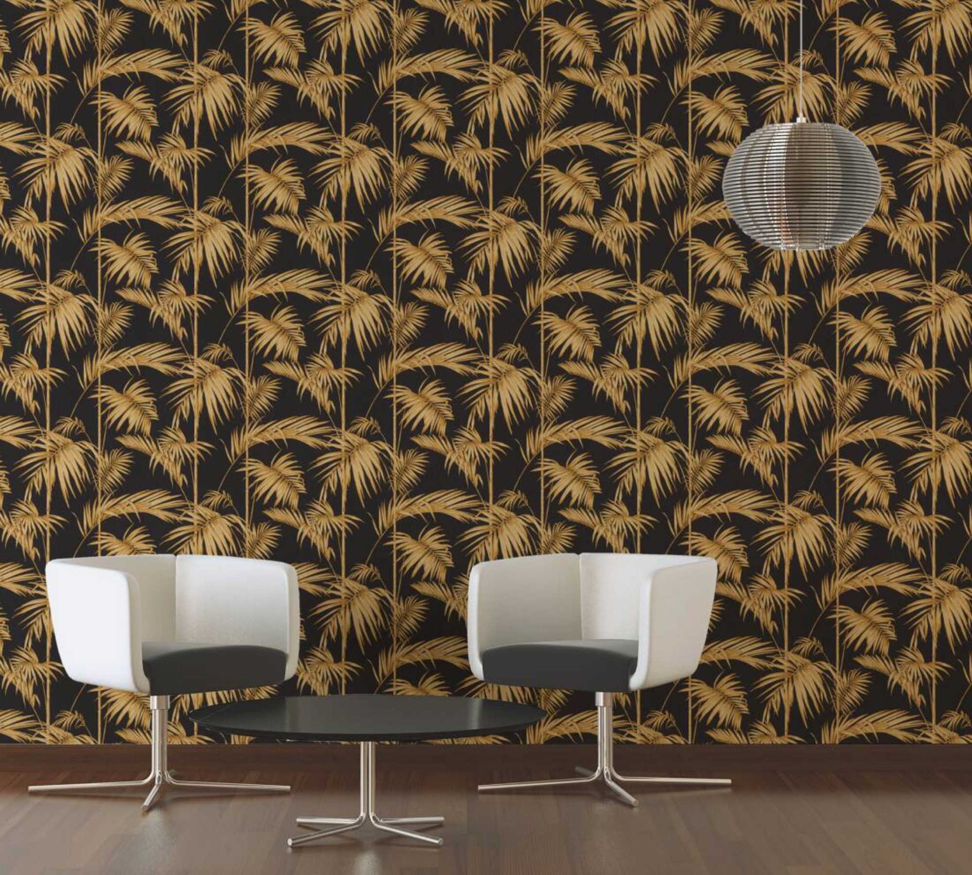 Ταπετσαρία Τοίχου με Τροπικά Φυτά σε χρυσό, καφέ χρώμα και μαύρο φόντο για την συλλογή Metropolitan Stories.