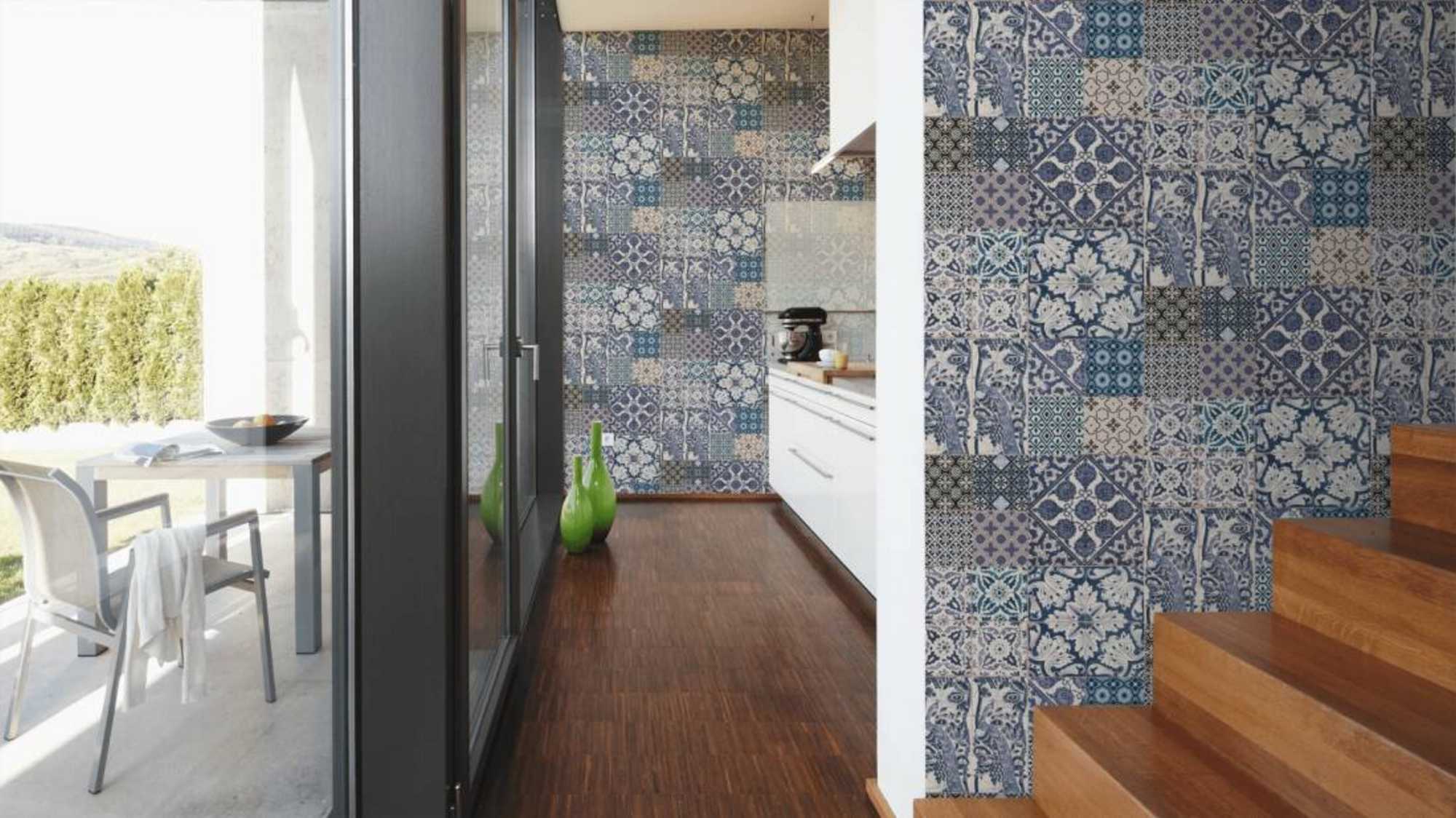 Ταπετσαρία τοίχου πλακάκια με ρετρό διάθεση σε λευκό, μπλε, καφέ και κρεμ αποχρώσεις για την συλλογή Metropolitan Stories.