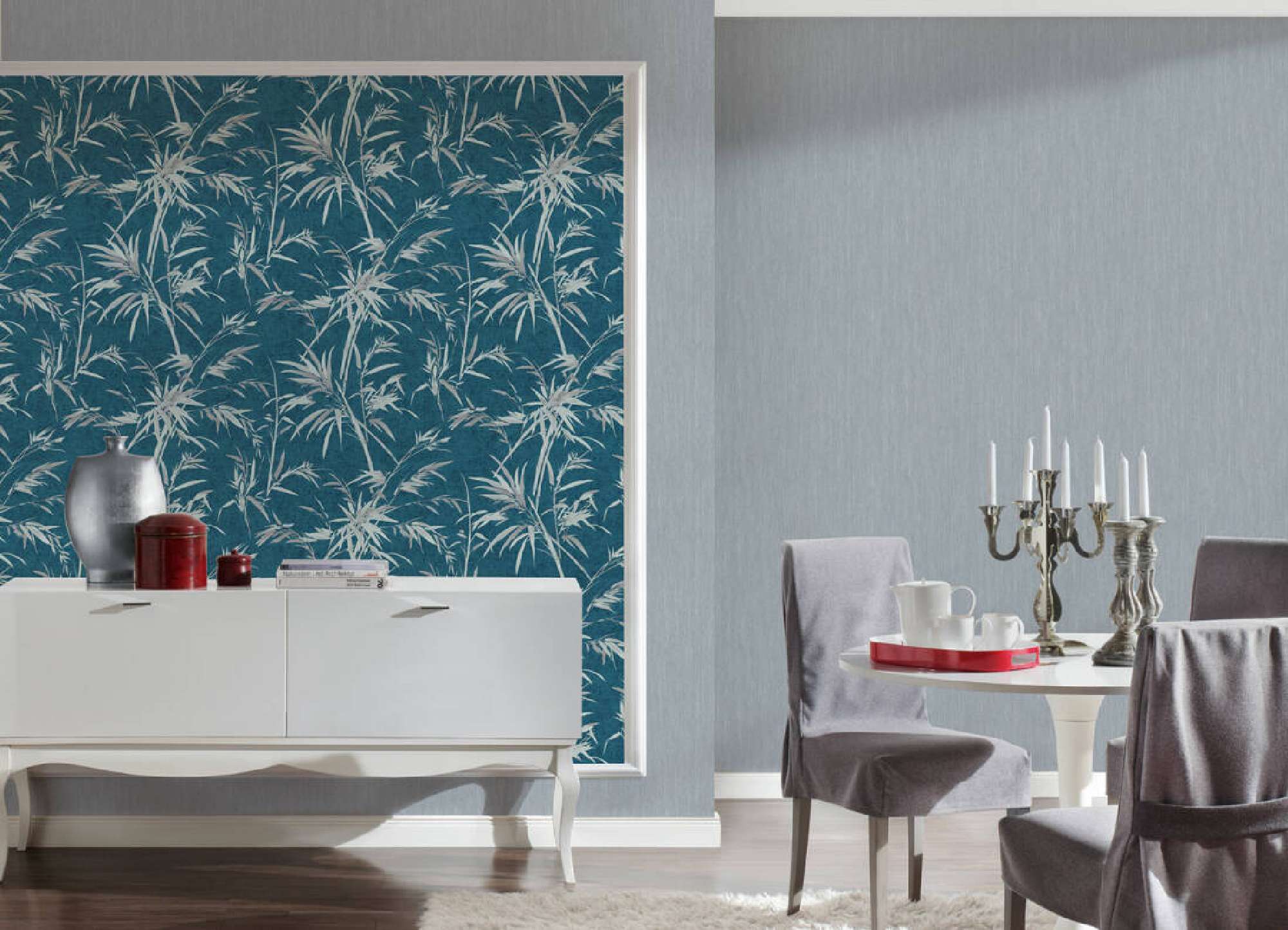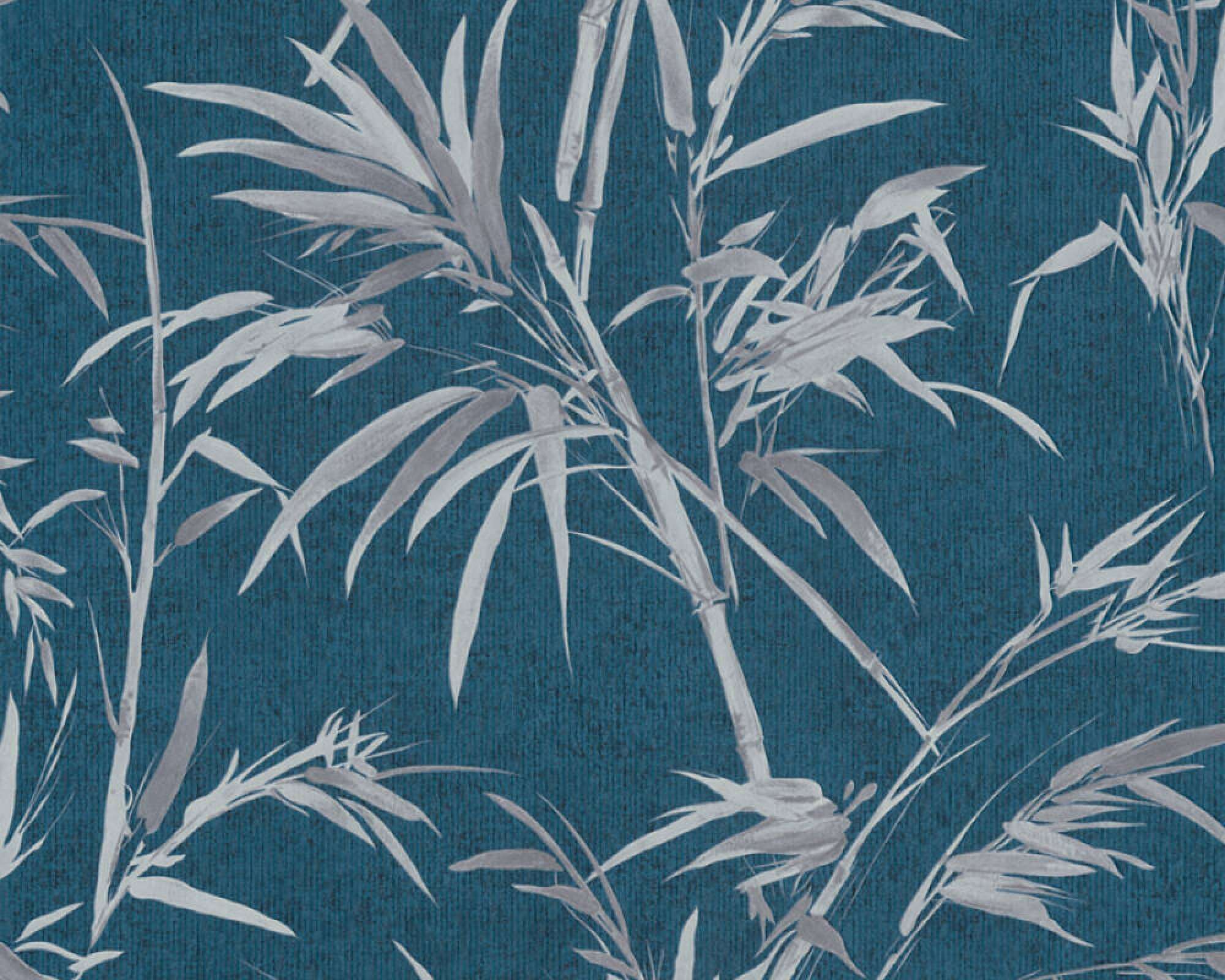 Τροπικά φυτά σε γκρί και ασημί αποχρώσεις επάνω σε μπλέ φόντο για την συλλογή Sumatra.