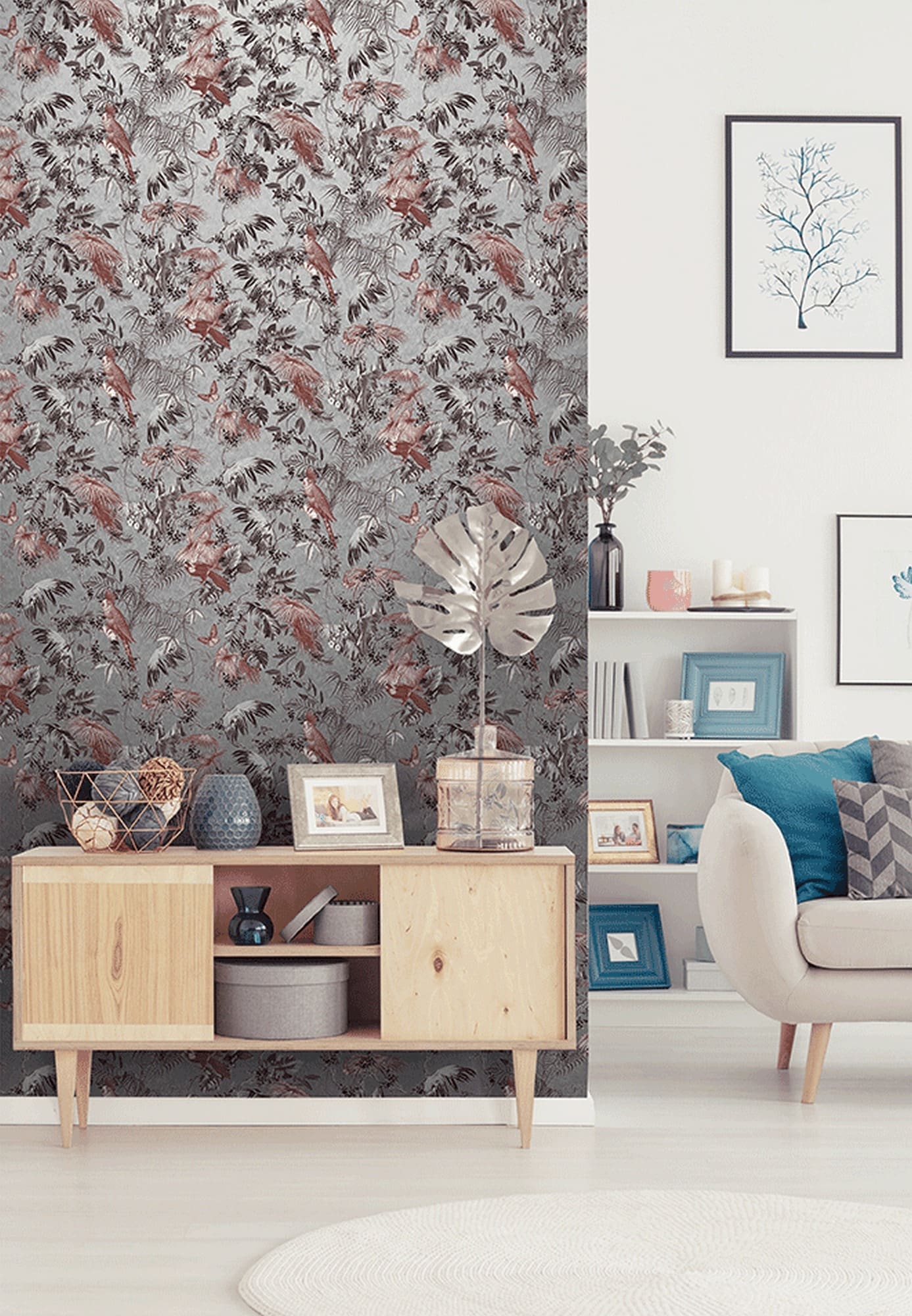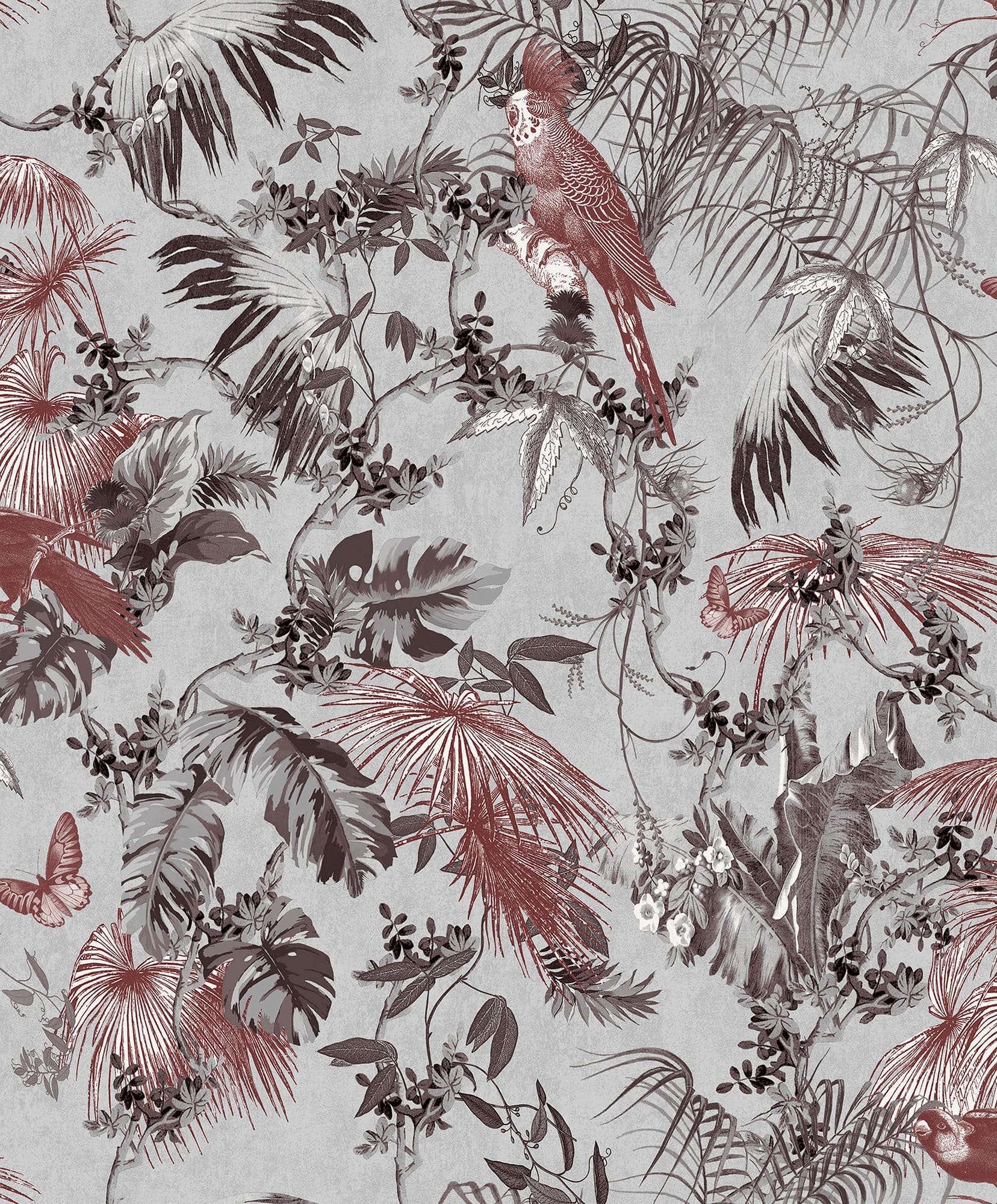 Ασημί και κόκκινα τροπικά φυτά και πουλιά σε γκρι φόντο για την συλλογή Escapade.