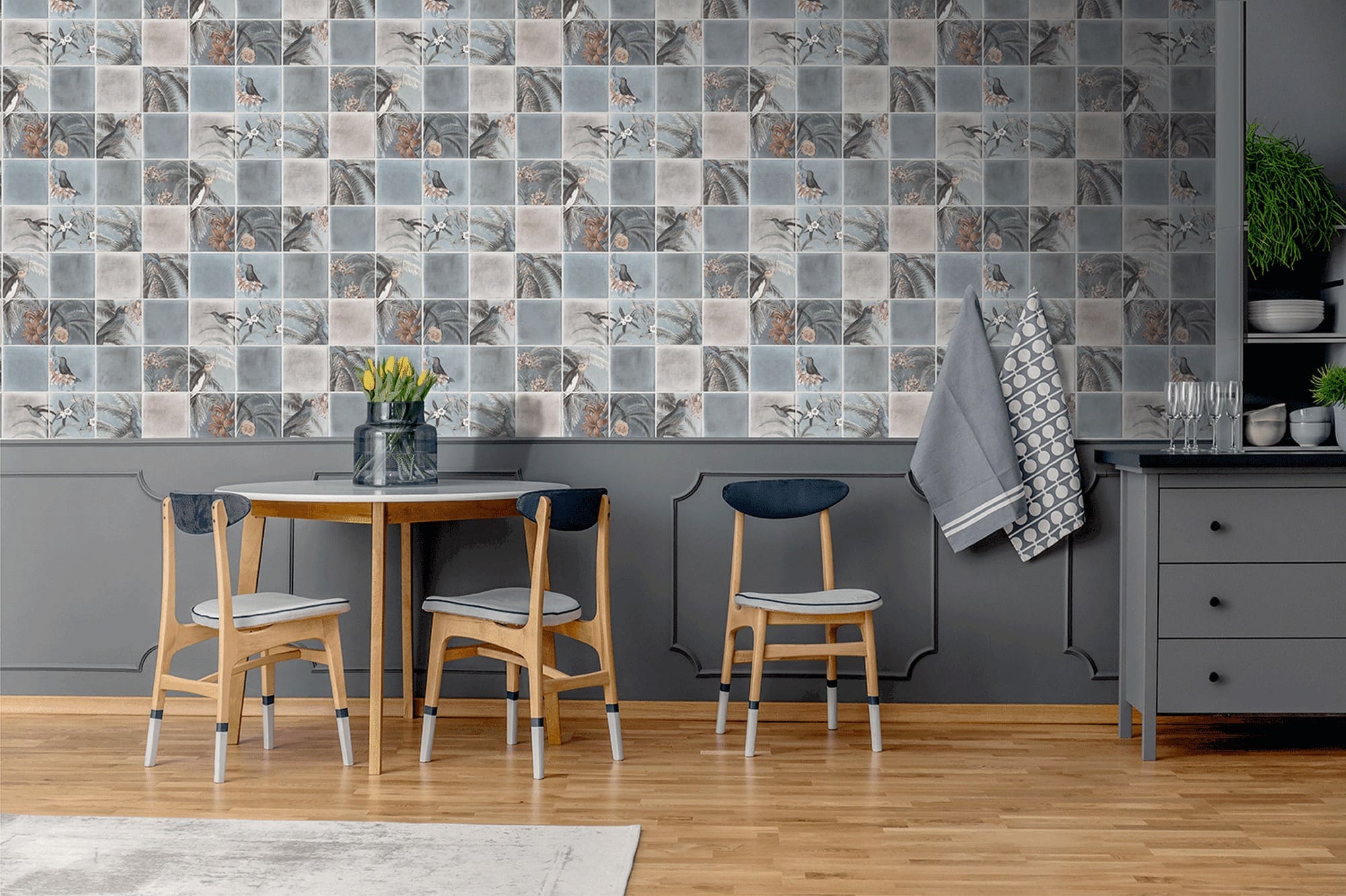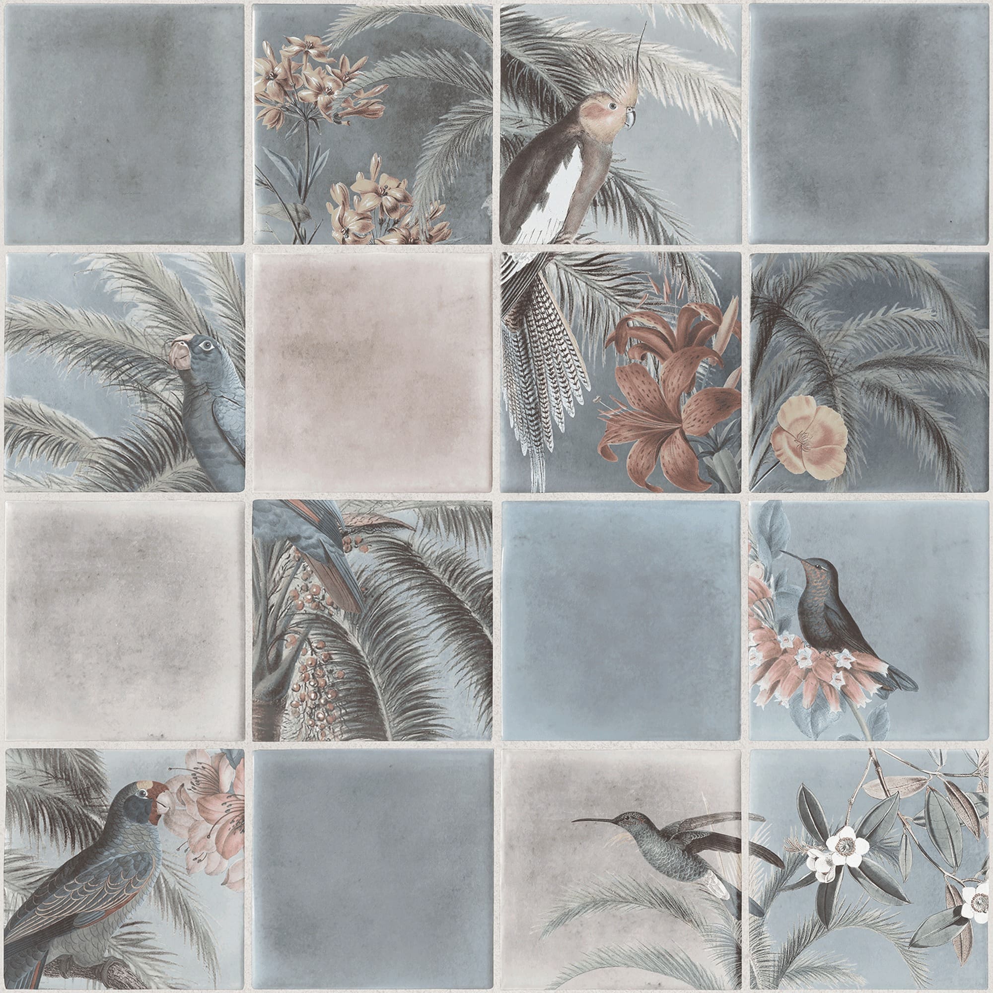 Τροπικά Φυτά και πουλιά επάνω σε πλακάκι, σε γκρι αποχρώσεις για την συλλογή Escapade.