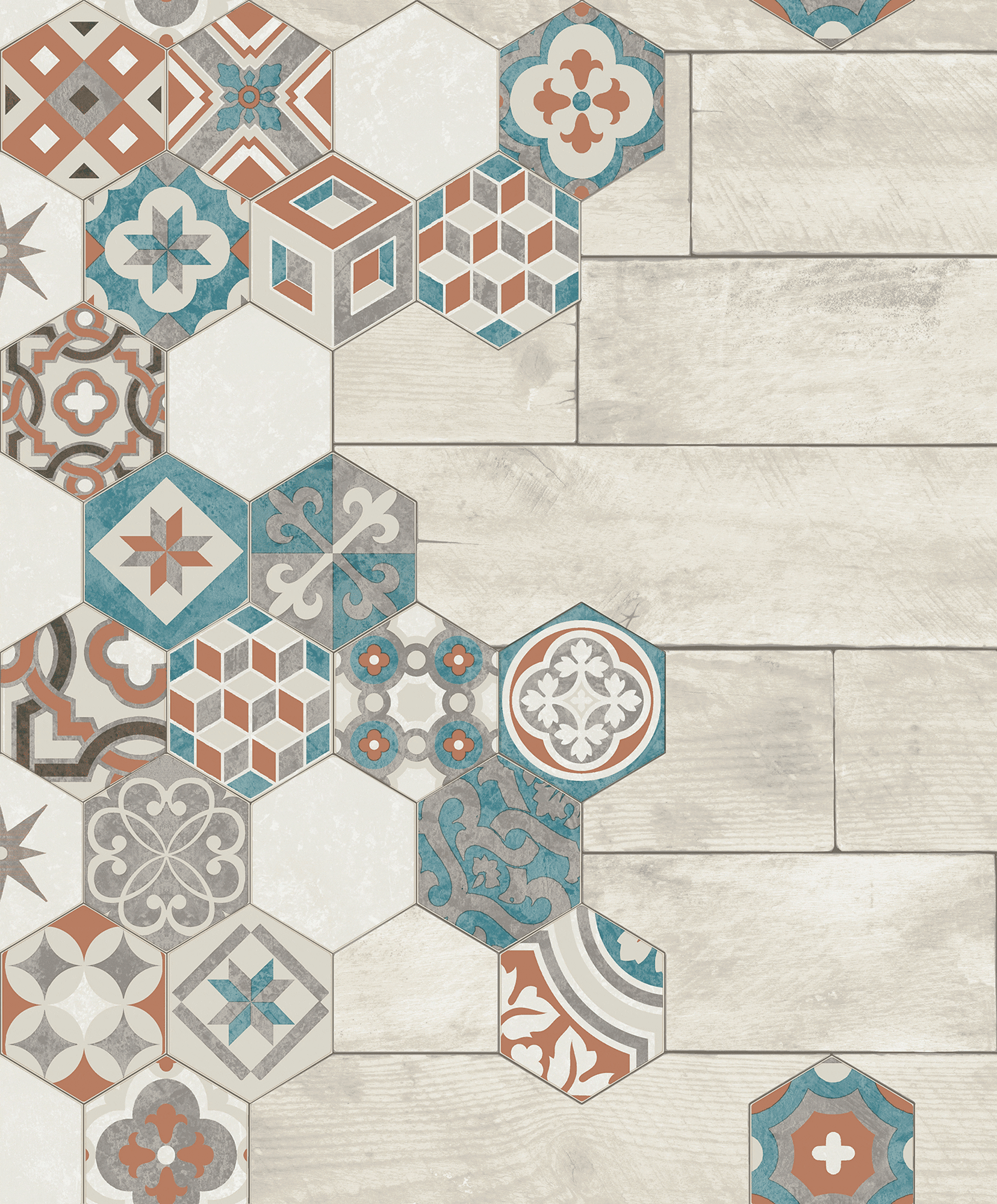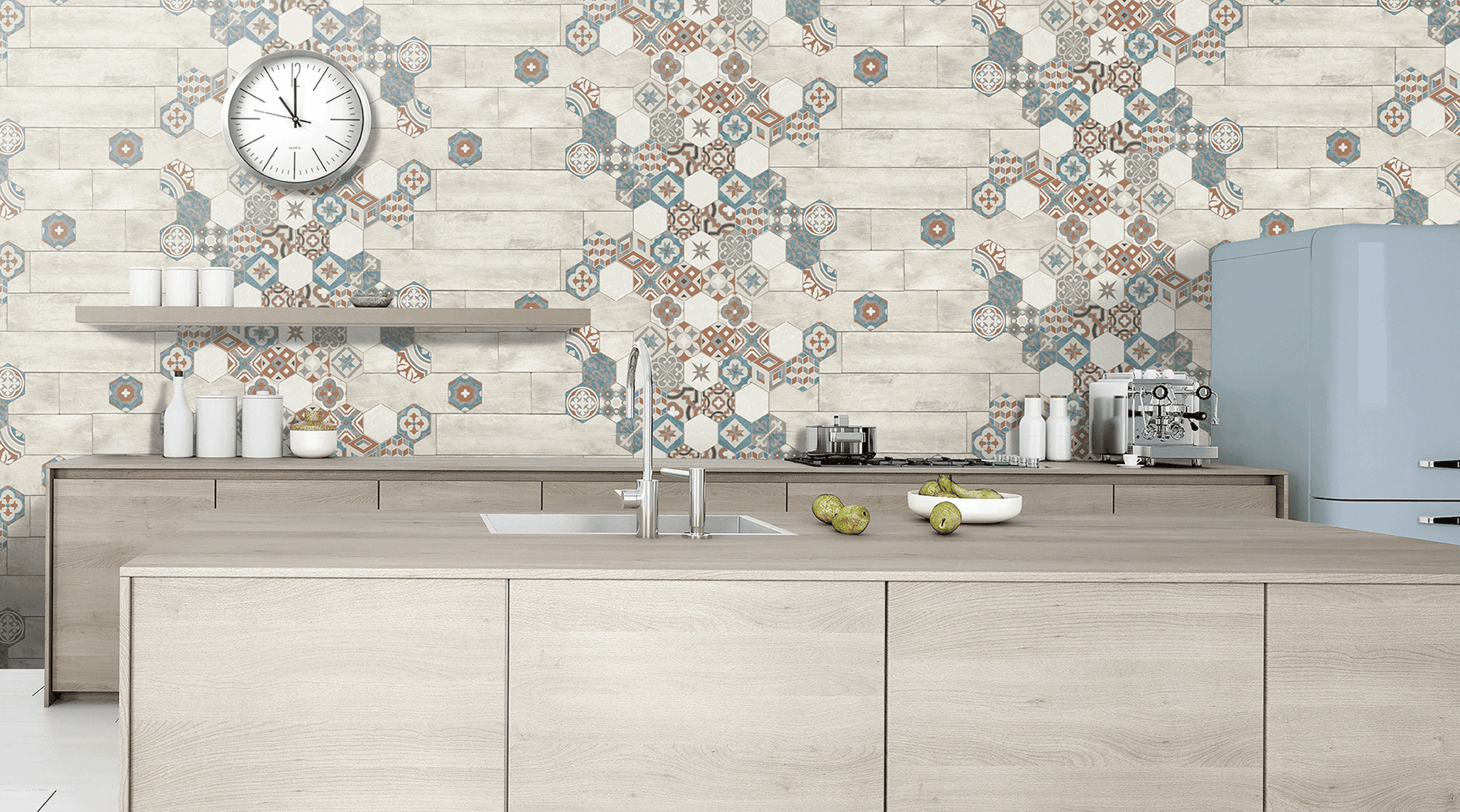 Λευκό ξύλο με πολύχρωμα πολύγωνα πλακάκια για την συλλογή Reflets
