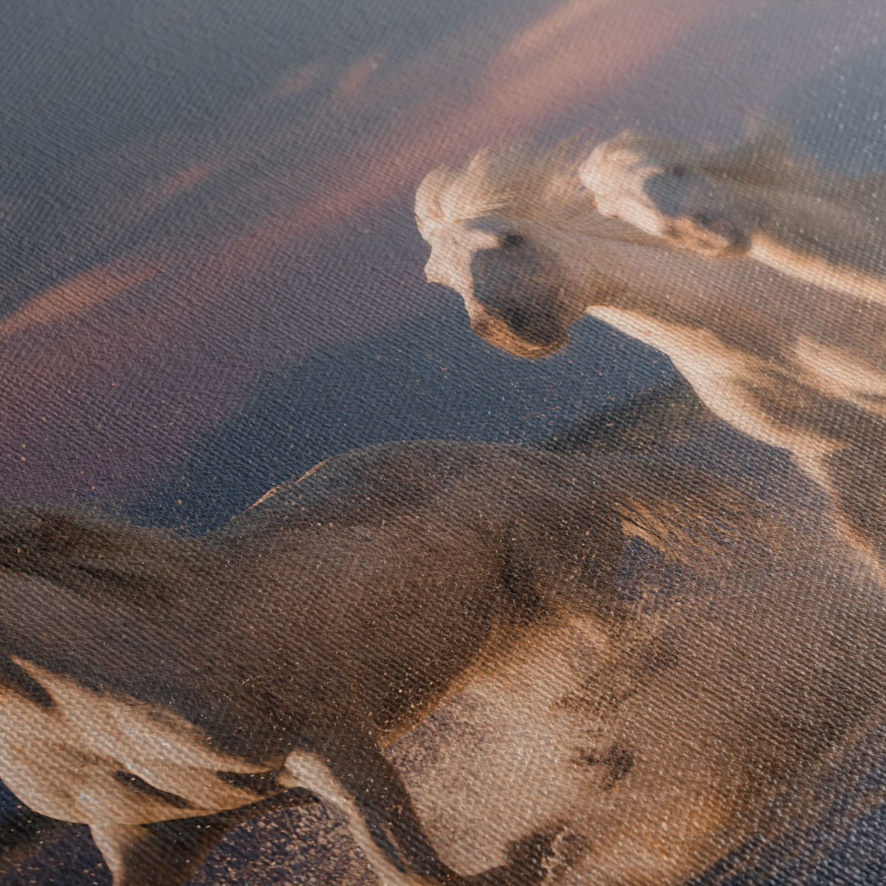 Μια καθηλωτική και δυναμική σύνθεση που απεικονίζει λευκά άλογα να καλπάζουν μέσα στο νερό κάτω από τα ζεστά χρώματα του ηλιοβασιλέματος.