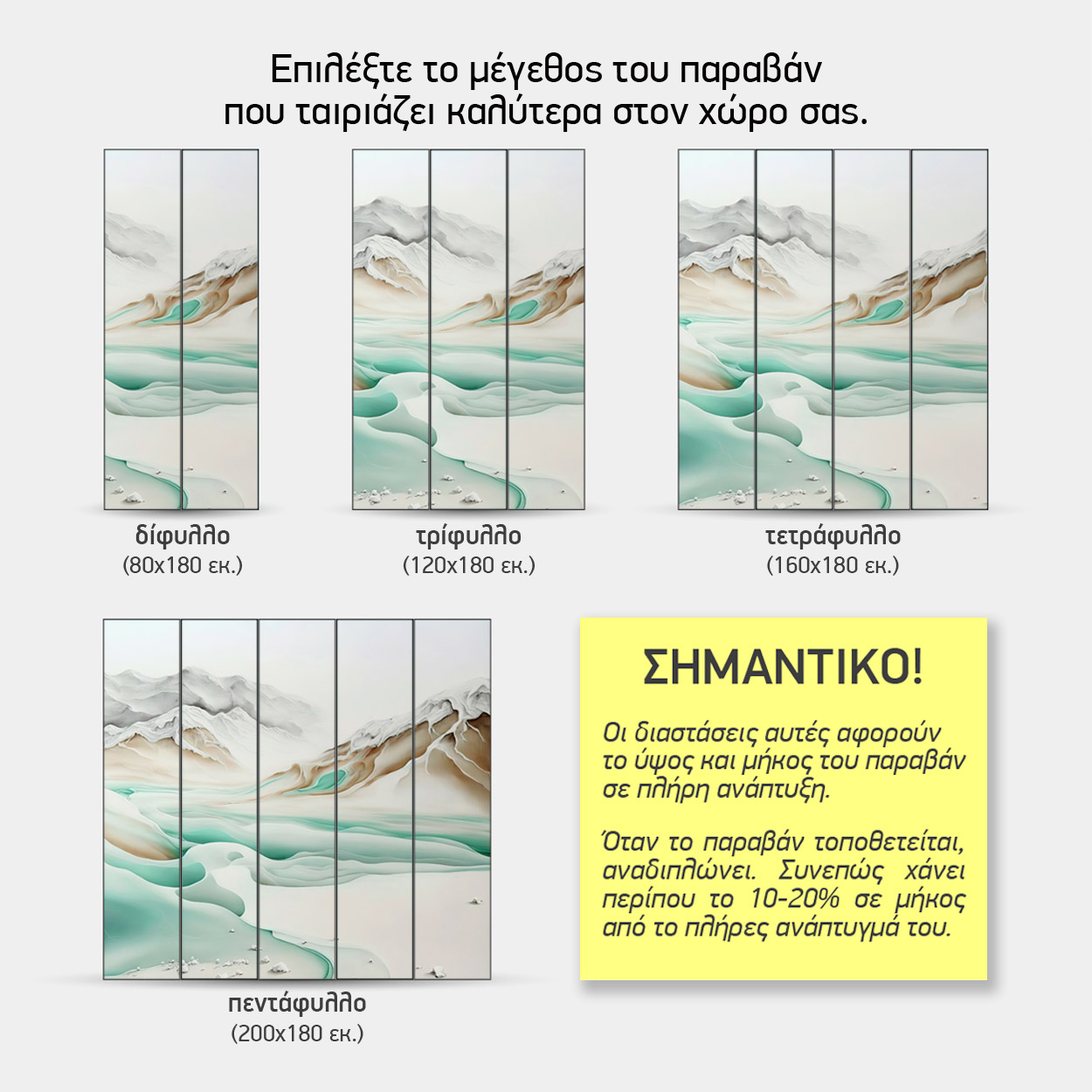 Σημαντική Σημείωση: Οι παραπάνω διαστάσεις αφορούν το παραβάν σε πλήρη ανάπτυξη. Κατά την τοποθέτηση, επειδή τα φύλλα αναδιπλώνονται (ζικ-ζακ) για να στέκονται, το ωφέλιμο μήκος μειώνεται κατά περίπου 10-20%.