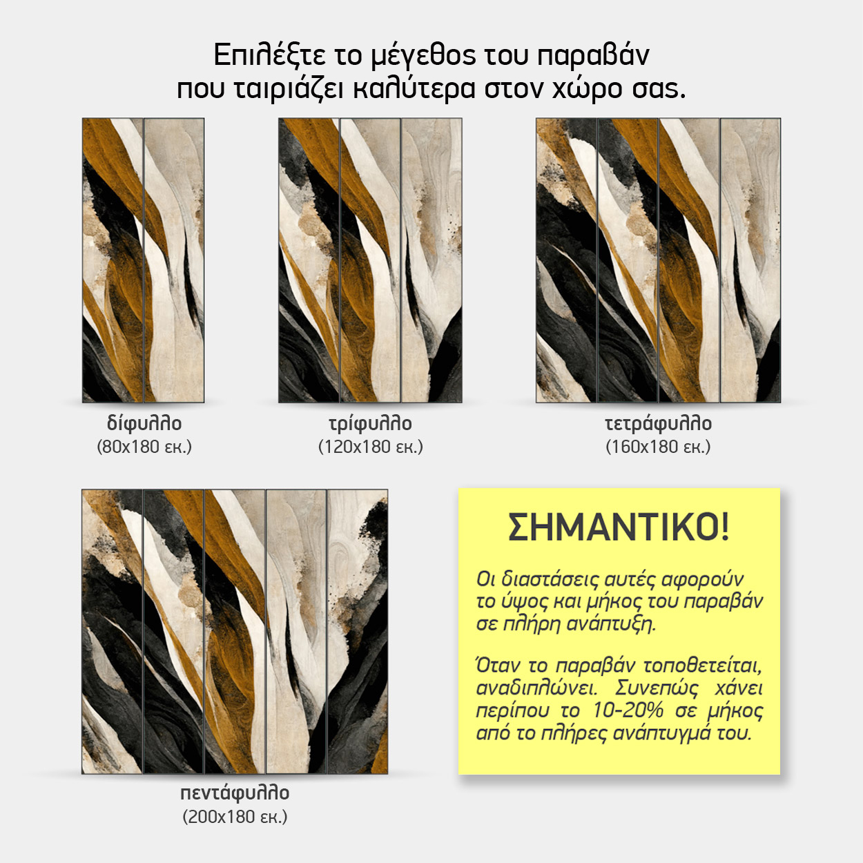 Σημαντική Σημείωση: Οι παραπάνω διαστάσεις αφορούν το παραβάν σε πλήρη ανάπτυξη. Κατά την τοποθέτηση, επειδή τα φύλλα αναδιπλώνονται (ζικ-ζακ) για να στέκονται, το ωφέλιμο μήκος μειώνεται κατά περίπου 10-20%.