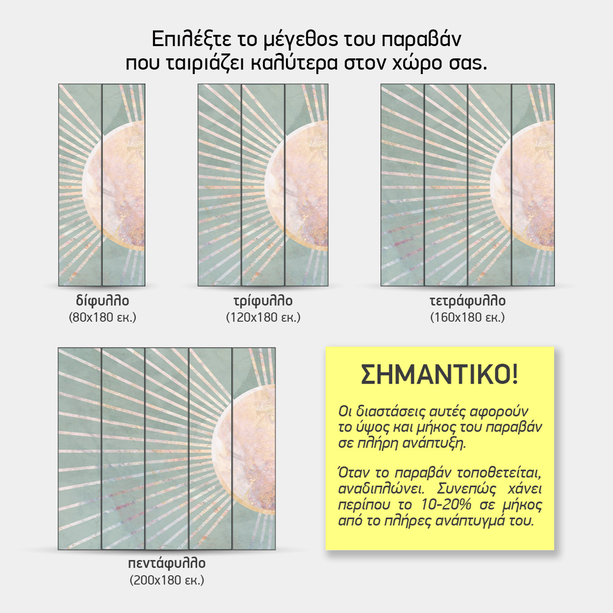 Σημαντική Σημείωση: Οι παραπάνω διαστάσεις αφορούν το παραβάν σε πλήρη ανάπτυξη. Κατά την τοποθέτηση, επειδή τα φύλλα αναδιπλώνονται (ζικ-ζακ) για να στέκονται, το ωφέλιμο μήκος μειώνεται κατά περίπου 10-20%.