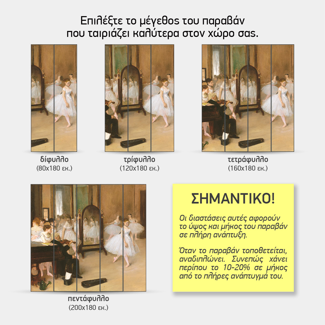 Σημαντική Σημείωση: Οι παραπάνω διαστάσεις αφορούν το παραβάν σε πλήρη ανάπτυξη. Κατά την τοποθέτηση, επειδή τα φύλλα αναδιπλώνονται (ζικ-ζακ) για να στέκονται, το ωφέλιμο μήκος μειώνεται κατά περίπου 10-20%.
