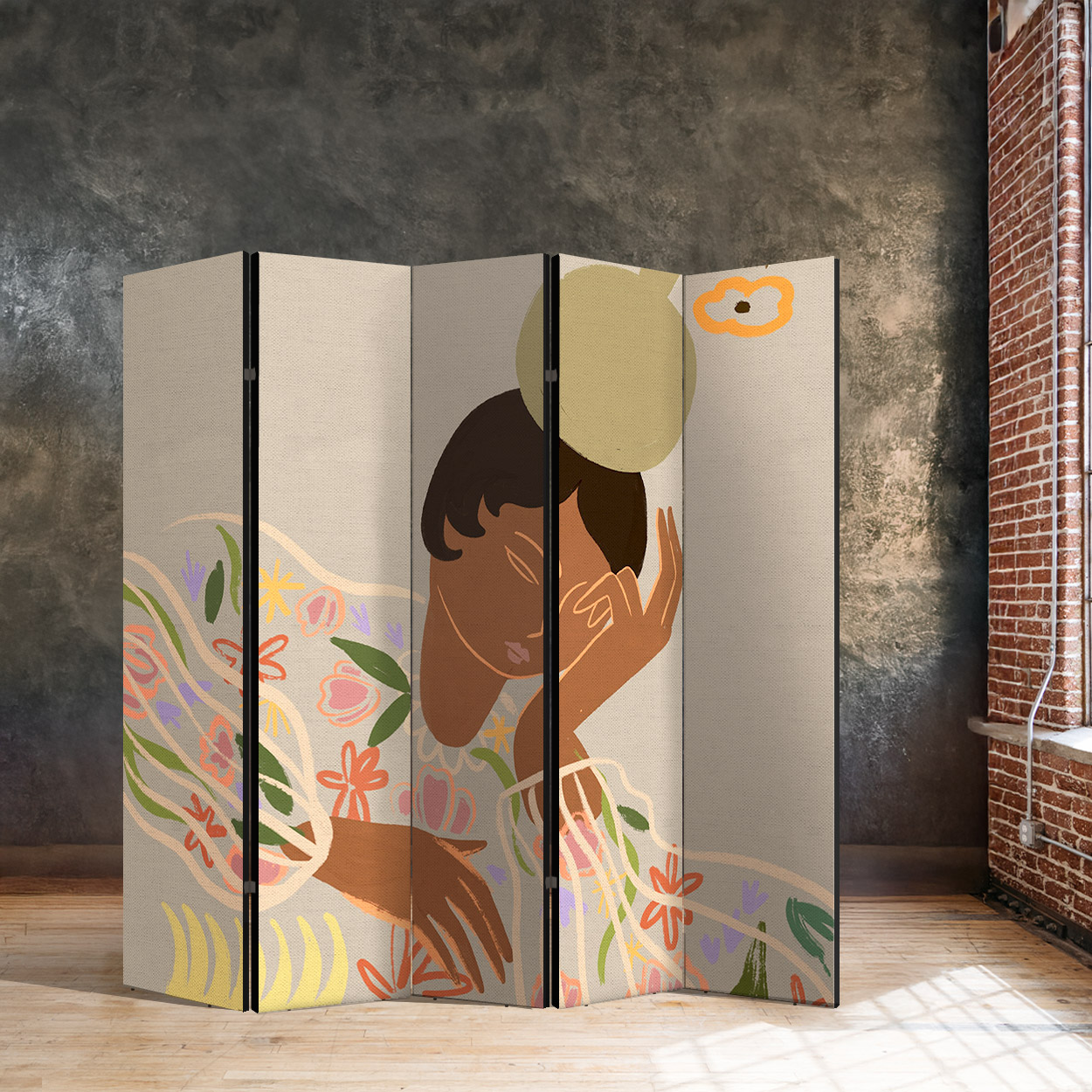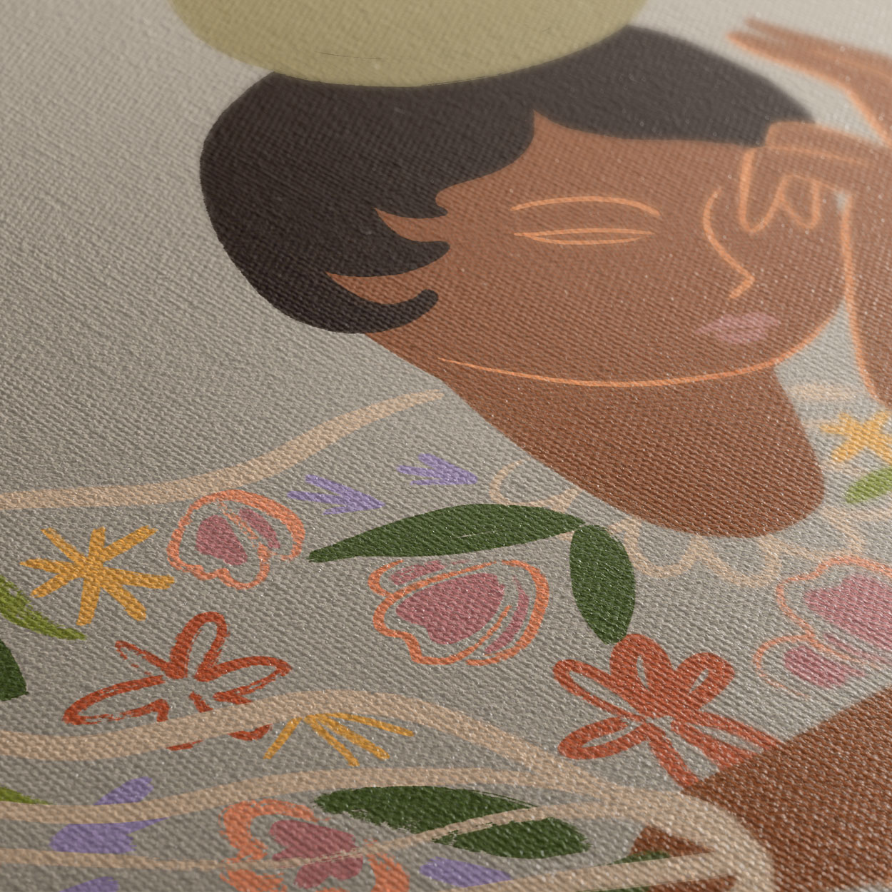 Μια γαλήνια και άκρως καλλιτεχνική σύνθεση που απεικονίζει μια γυναικεία φιγούρα μέσα από μινιμαλιστικές γραμμές και απαλά, γήινα χρώματα. Το σχέδιο εμπλουτίζεται με αφηρημένα floral στοιχεία και έναν διακριτικό ήλιο σε τόνους της ώχρας, δημιουργώντας ένα αποτέλεσμα που θυμίζει σύγχρονη τοιχογραφία με boho επιρροές.