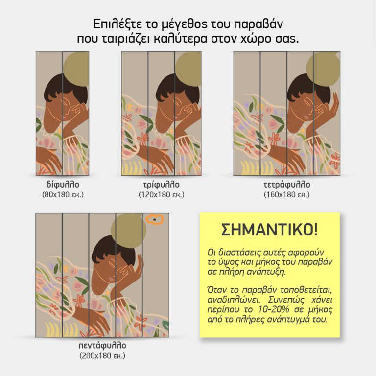 Σημαντική Σημείωση: Οι παραπάνω διαστάσεις αφορούν το παραβάν σε πλήρη ανάπτυξη. Κατά την τοποθέτηση, επειδή τα φύλλα αναδιπλώνονται (ζικ-ζακ) για να στέκονται, το ωφέλιμο μήκος μειώνεται κατά περίπου 10-20%.