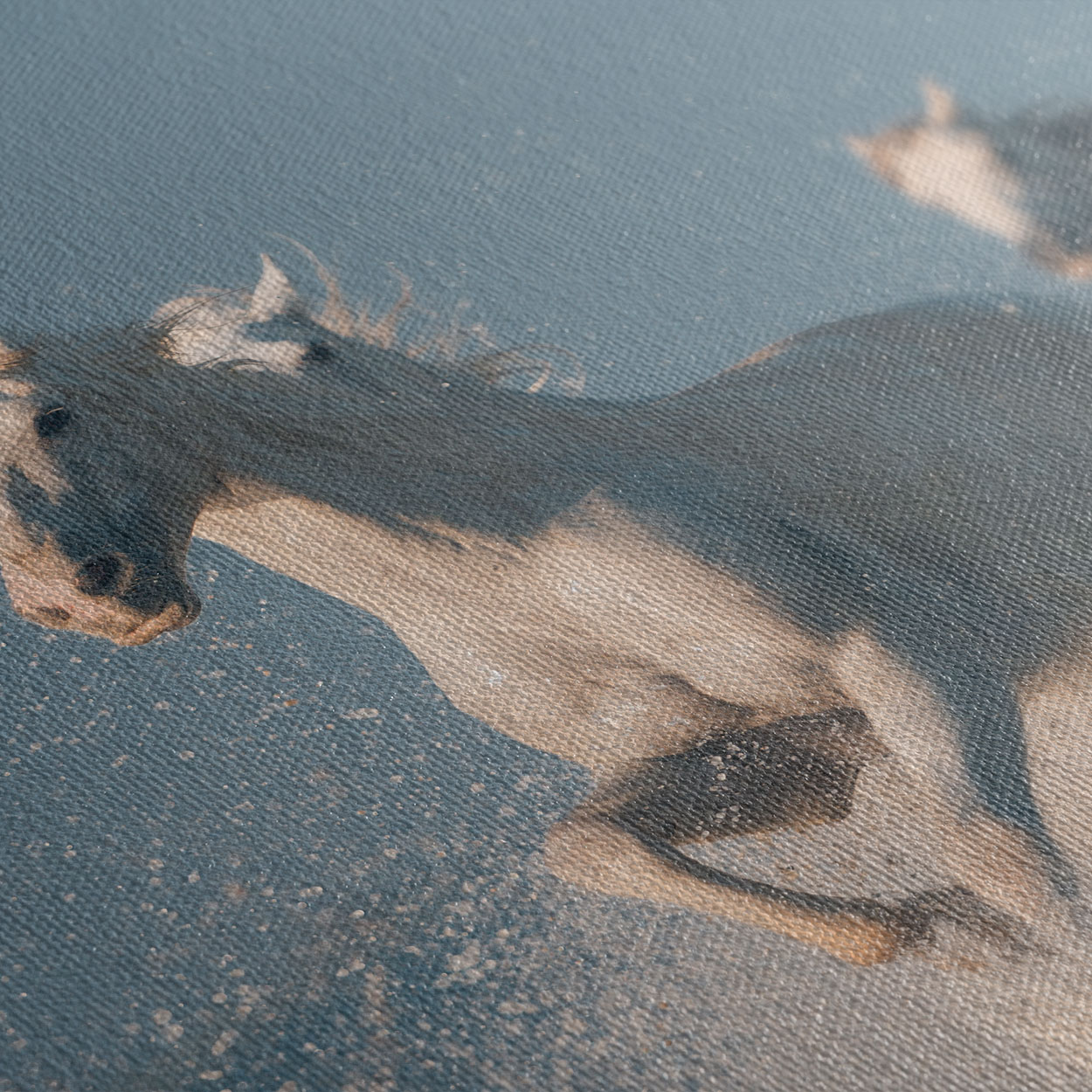 Μια δυναμική και αναζωογονητική σύνθεση που απεικονίζει λευκά άλογα να καλπάζουν ελεύθερα μέσα στο νερό.